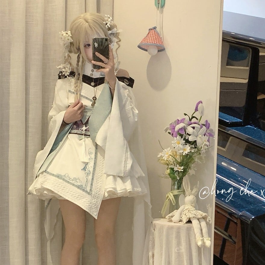 着物風羽織とジャンパースカートに龍刺繍入りコルセットベルトを重ねた白基調のデザインが特徴で、撮影会やイベントで静かな神秘性を纏いたい方に最適です。広がる袖と引き締まったウエストラインが重なり、軽やかさと凛とした存在感を両立できます。