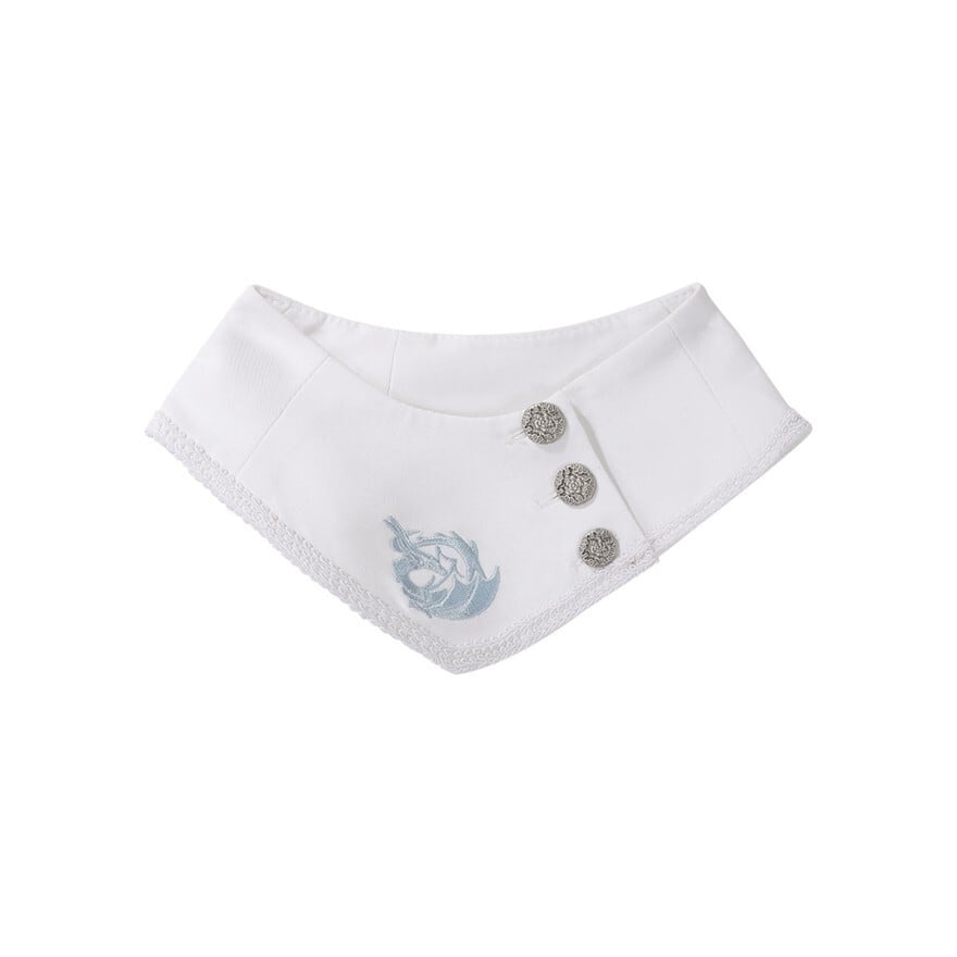 白の静けさに、龍の気配と淡い青の余韻がそっと差し込むような一着です。和洋折衷の輪郭に中華ゴシックの幻想が重なり、纏うだけで儚さと気品をあわせ持つ世界観が完成します。
