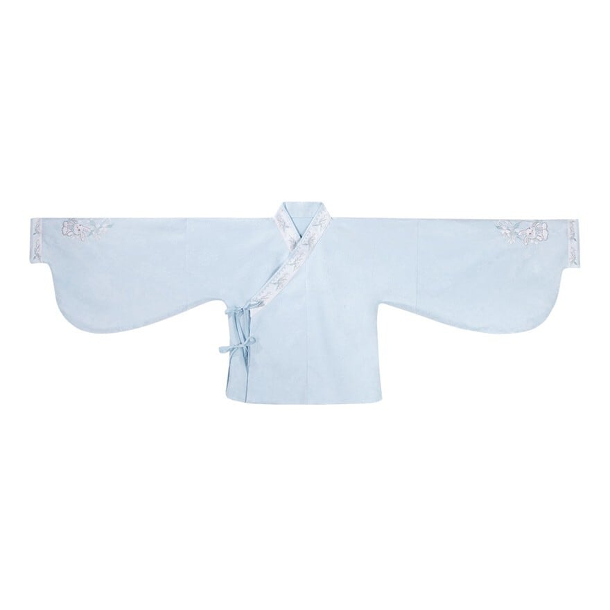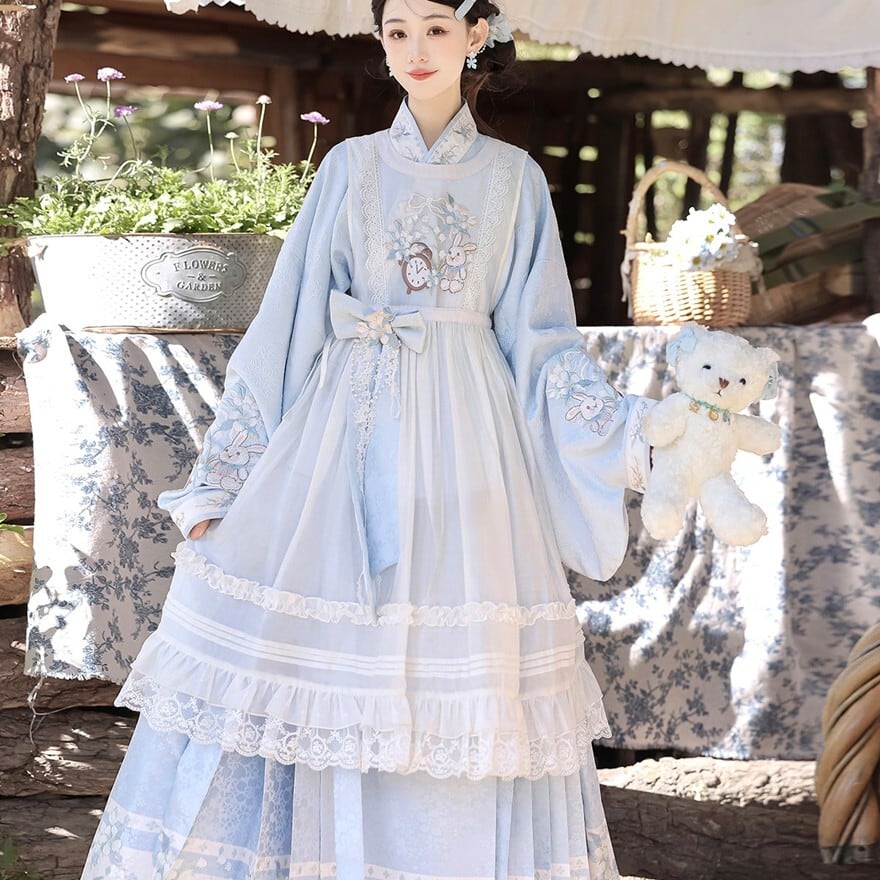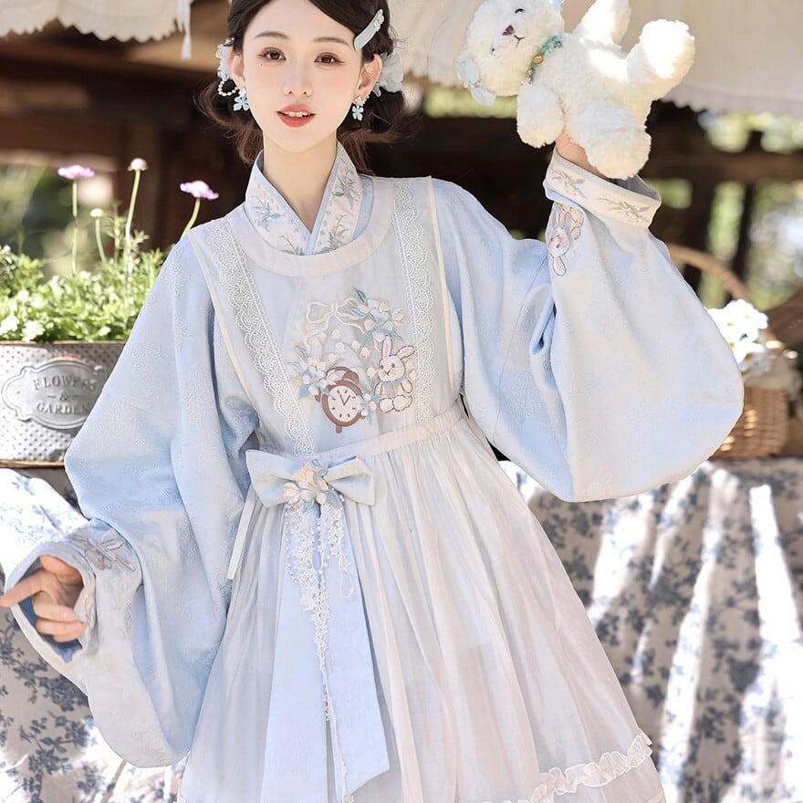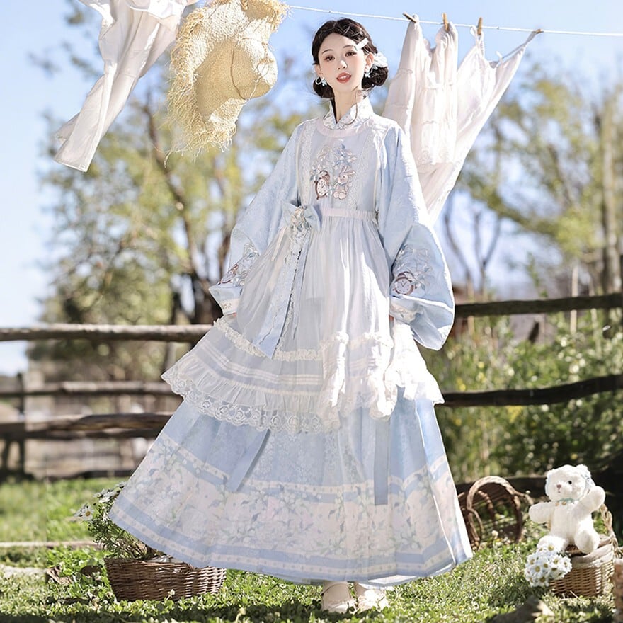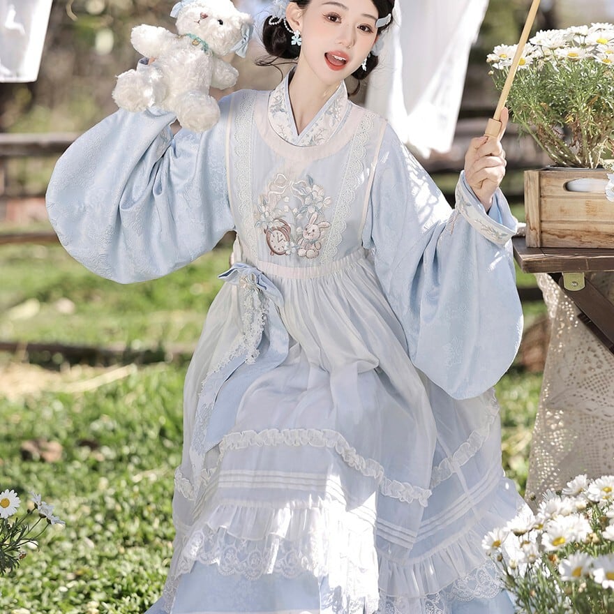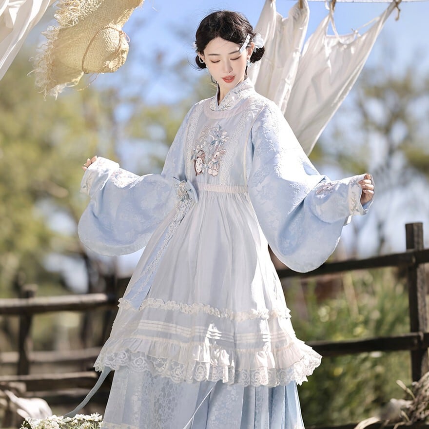 淡い空色に白い花びらが舞い降りたような、やさしく澄んだ空気を感じる一着です。袖を広げた瞬間にふわりと余韻が生まれ、儚さと気品をあわせ持つ中華ロリータの世界観を完成させてくれます。