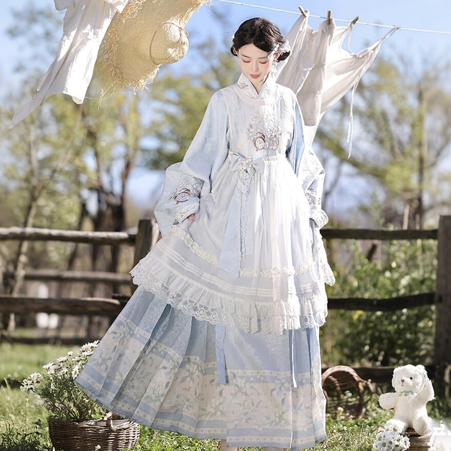 ブルー×ホワイトの柔らかな配色に花刺繍を添えた羽織トップス、オーバースカート、ロングスカートの重なりが特徴で、撮影会やおでかけで上品な物語性を纏いたい方に最適です。軽やかな色合いと重なりのあるシルエットが、静かな華やかさを引き立ててくれます。