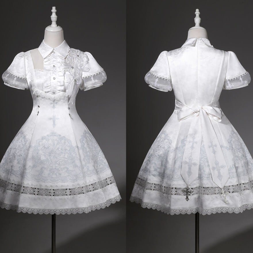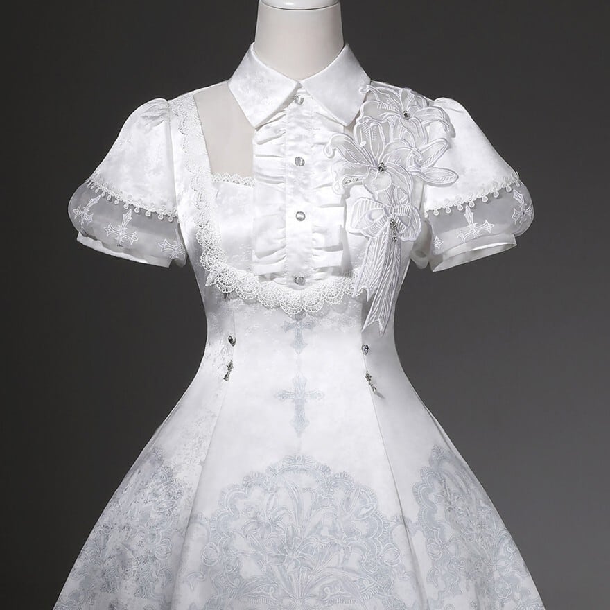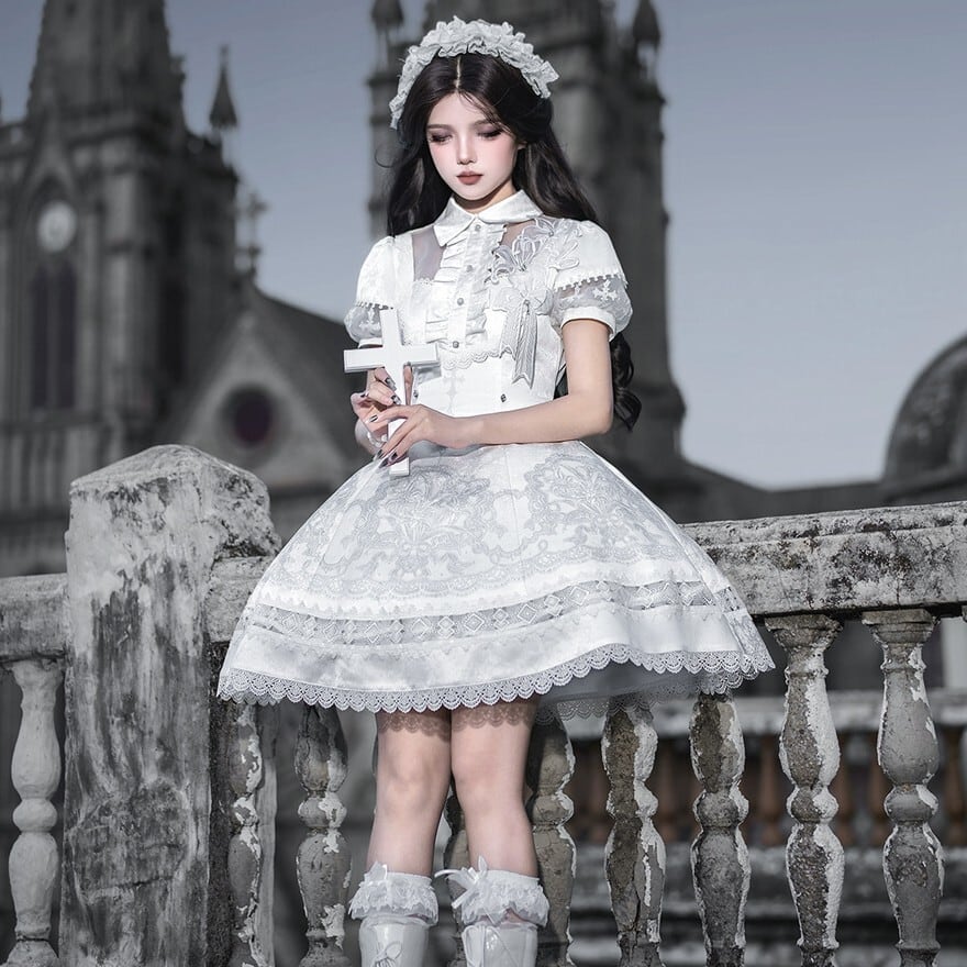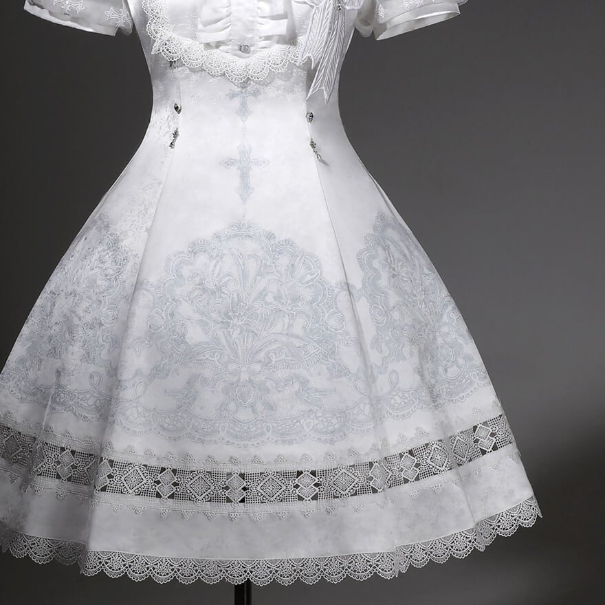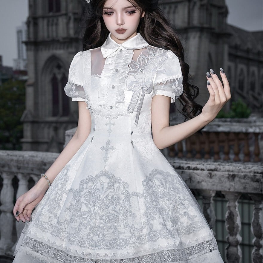 朝靄のような白の奥に、祈りの気配を残した十字架の意匠が静かに浮かぶ一着です。澄んだ空気を纏うような気品と、ゴシックロリィタならではの物語性が、佇まいそのものを印象深く見せてくれます。