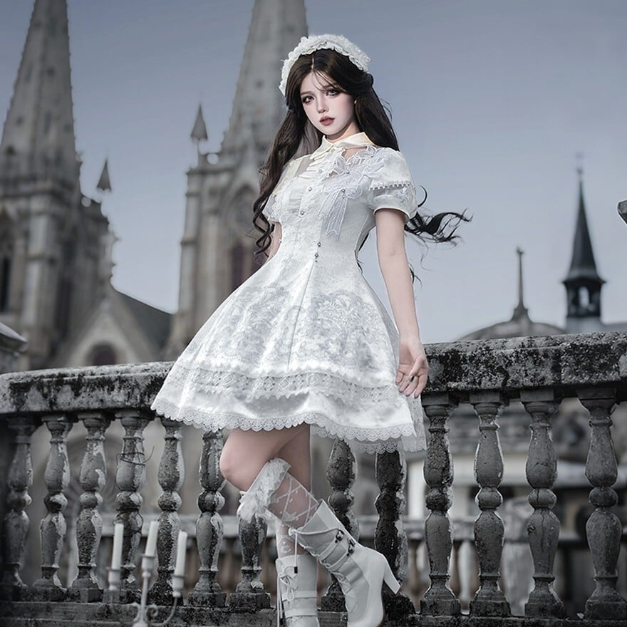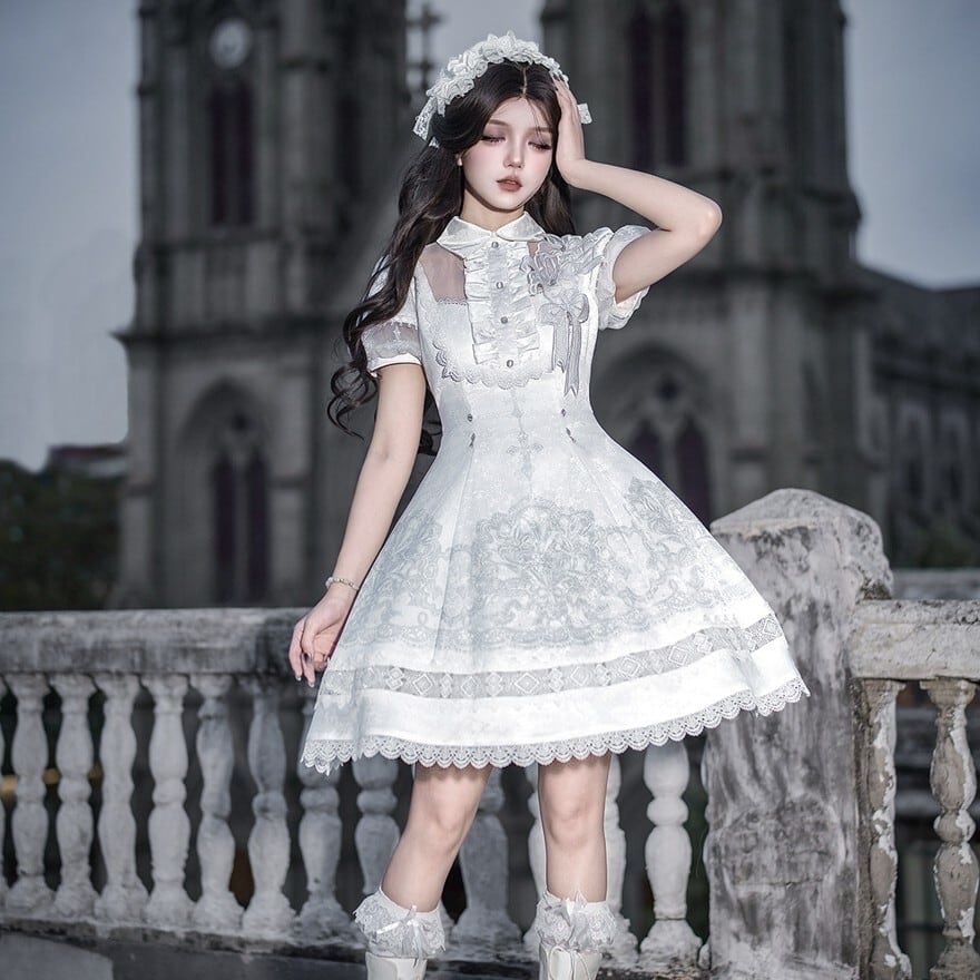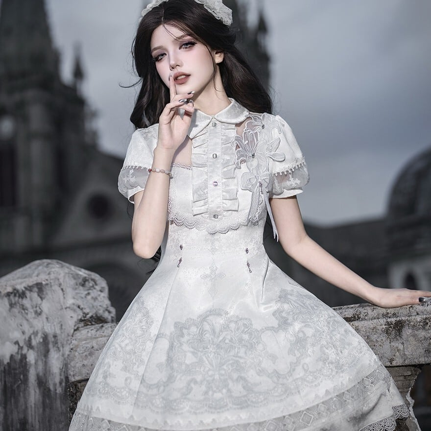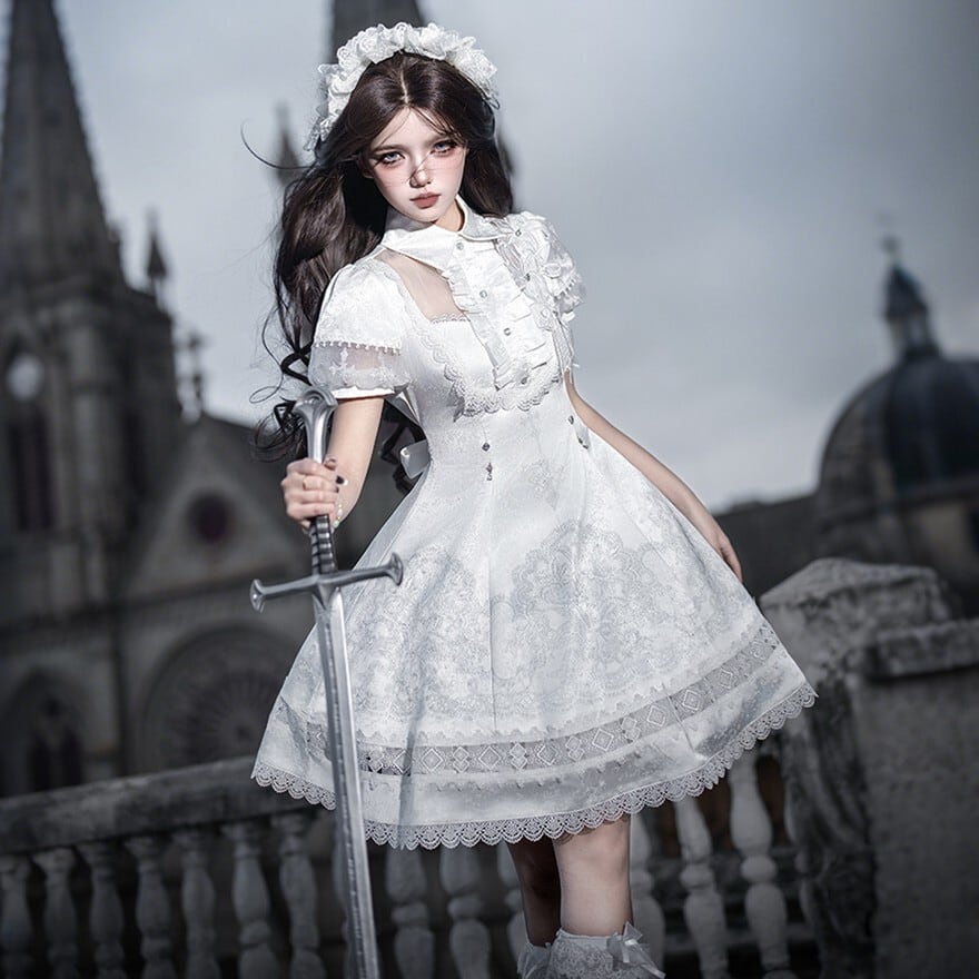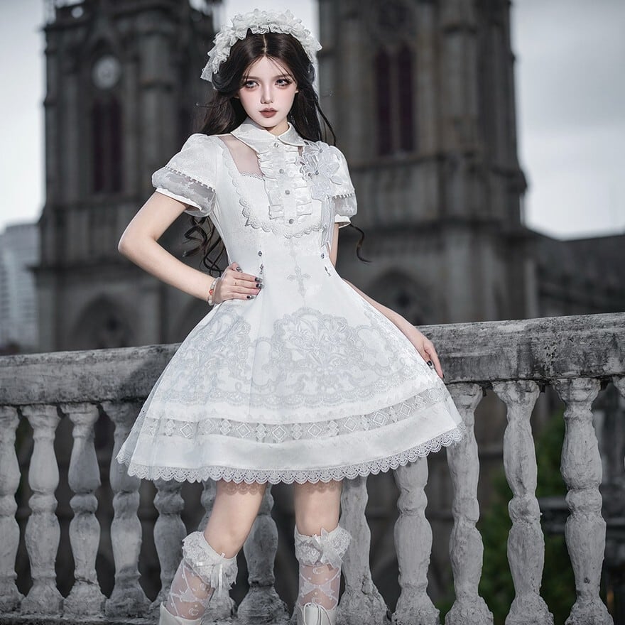 朝靄のような白の奥に、祈りの気配を残した十字架の意匠が静かに浮かぶ一着です。澄んだ空気を纏うような気品と、ゴシックロリィタならではの物語性が、佇まいそのものを印象深く見せてくれます。