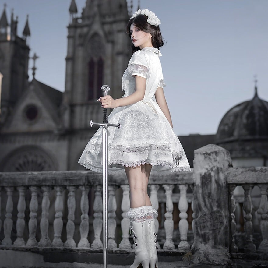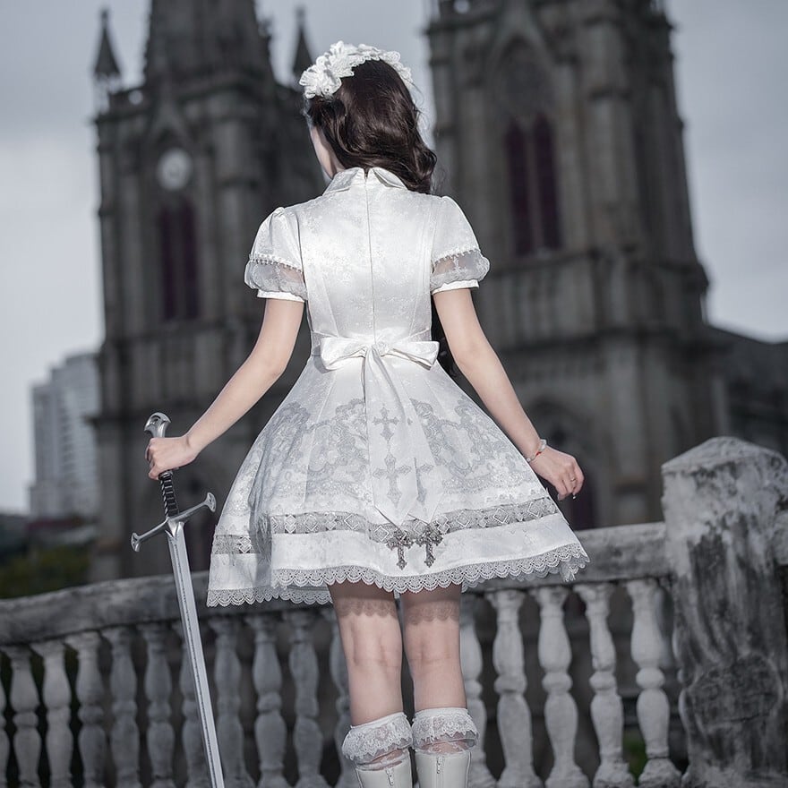 白系のロリィタは甘く見えすぎそう、でも重たい黒ではなく澄んだ雰囲気を選びたい。そんな方にも取り入れやすいワンピースです。十字架柄や裾の装飾がしっかり世界観を支えながら、半袖の軽やかさと整ったフレアラインで全体がすっきりまとまるため、可憐さと厳かさのバランスを取りやすくなっています。