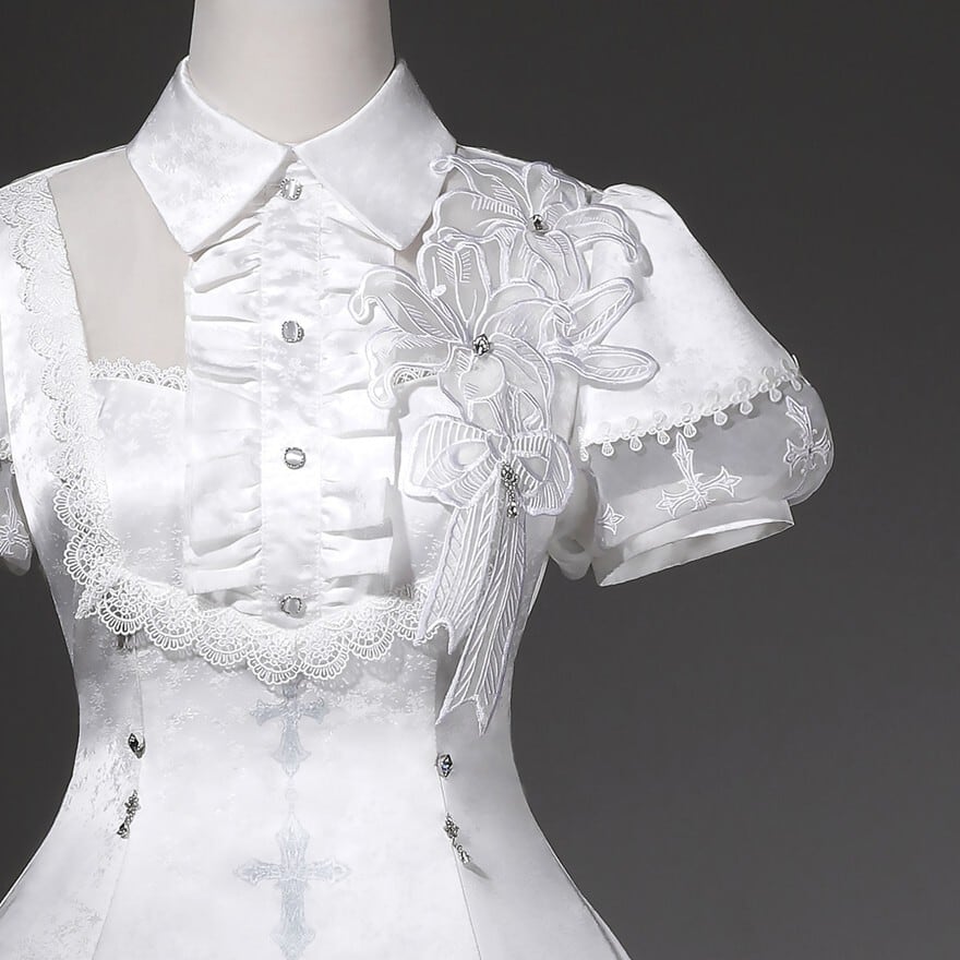 ・柄:スカート部分に十字架や装飾柄をあしらい、清らかさの中にゴシックの余韻を添えています。