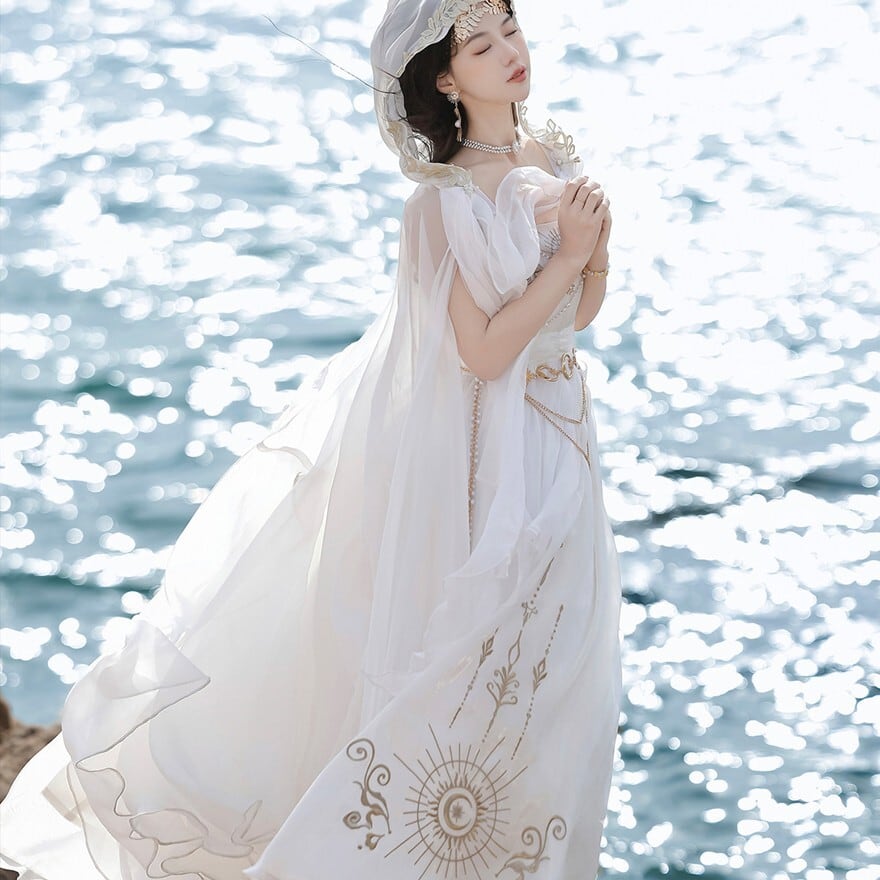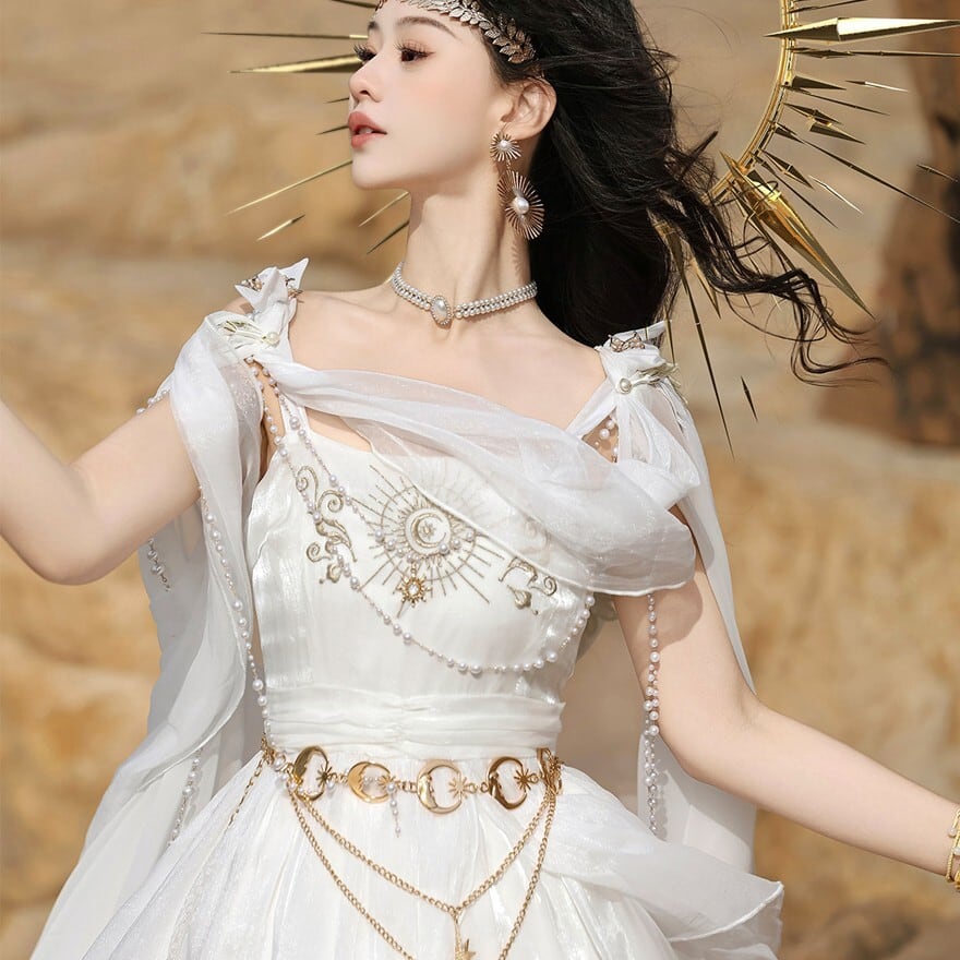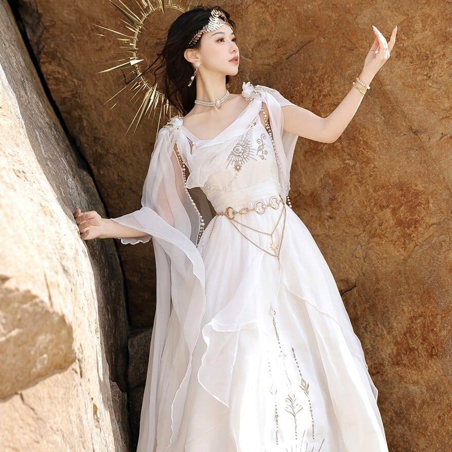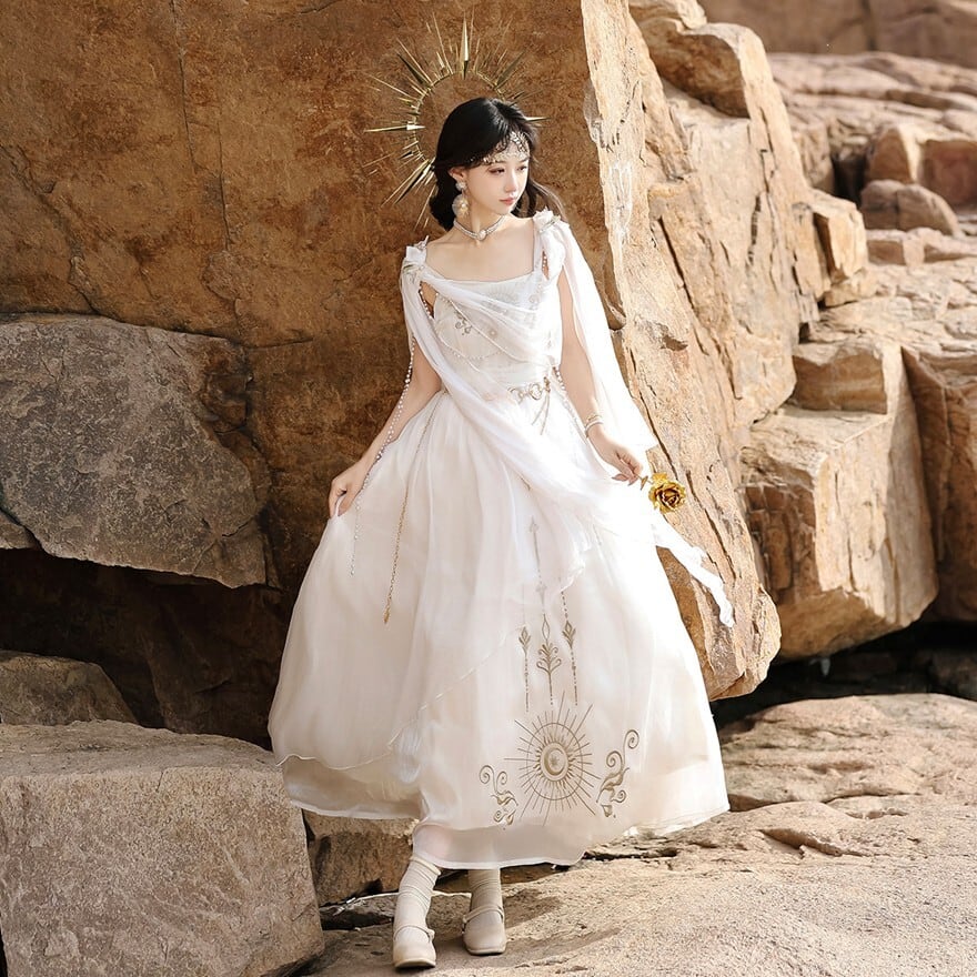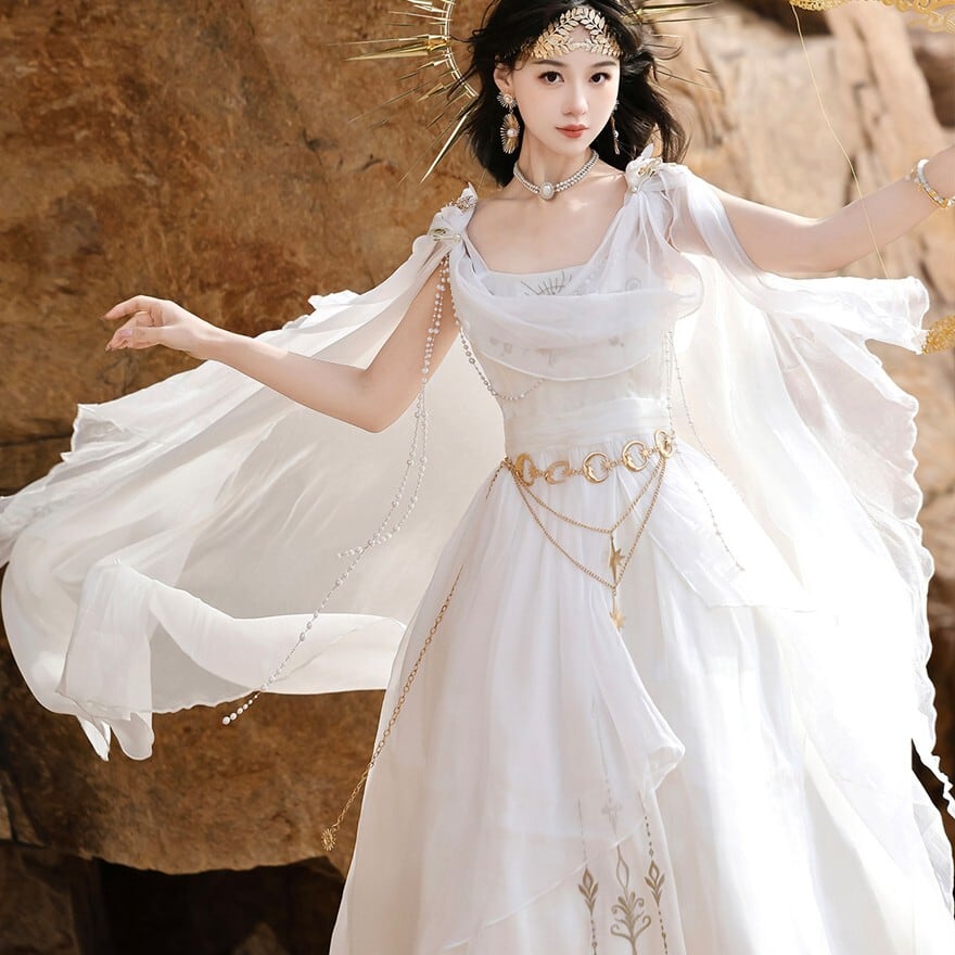 白い祈りをそのまま衣装に落とし込んだような、静謐で神秘的な一着です。揺れるケープと裾に宿る金の意匠が、光の中で儚さと格調を同時に引き立て、物語の中の巫女や聖女のような空気を纏わせます。