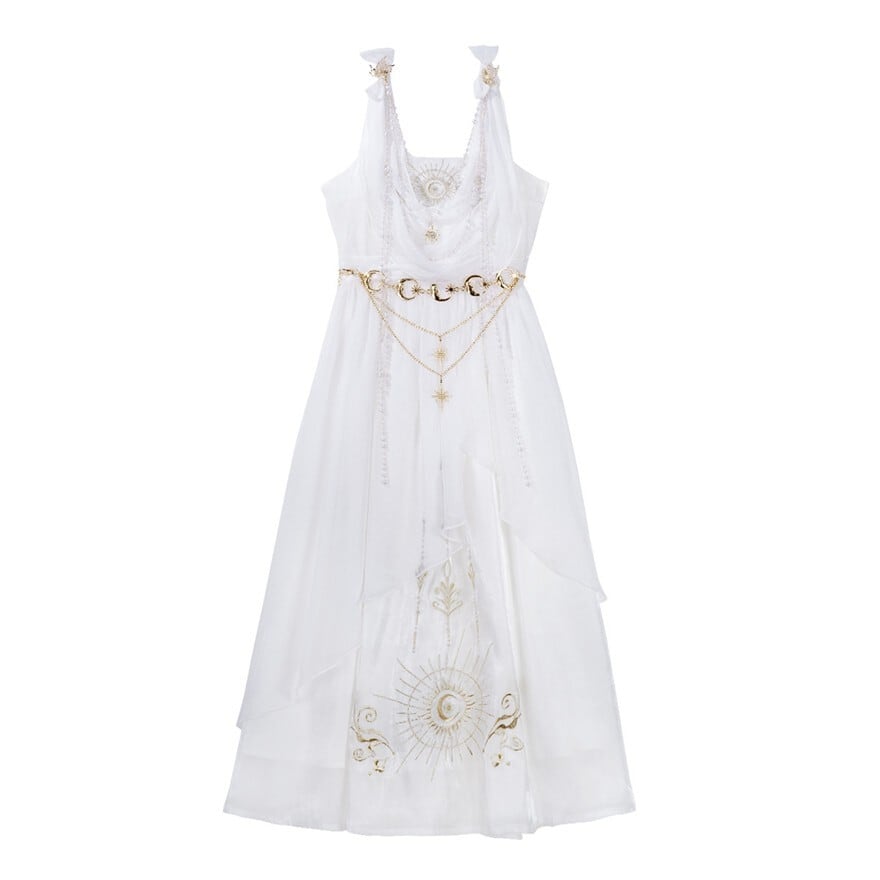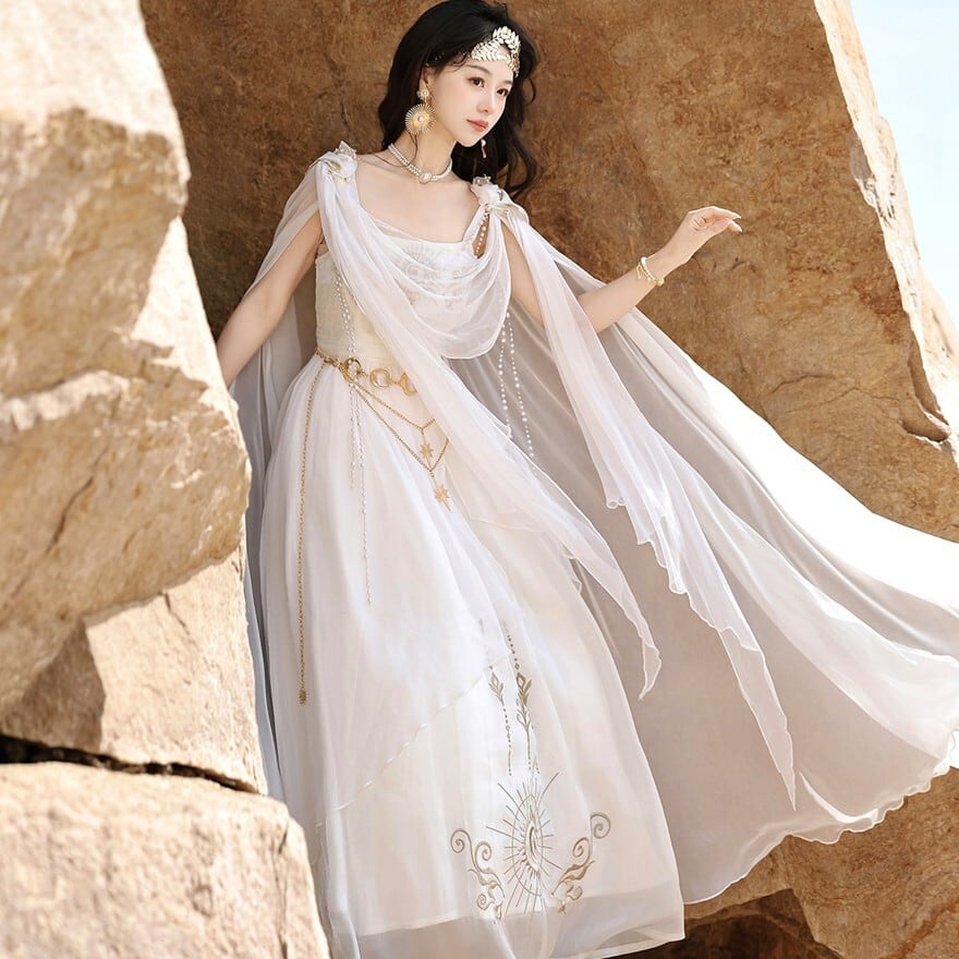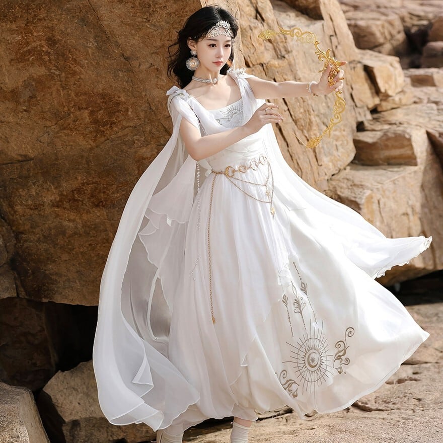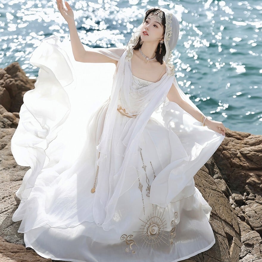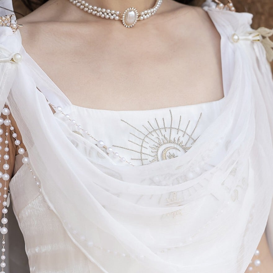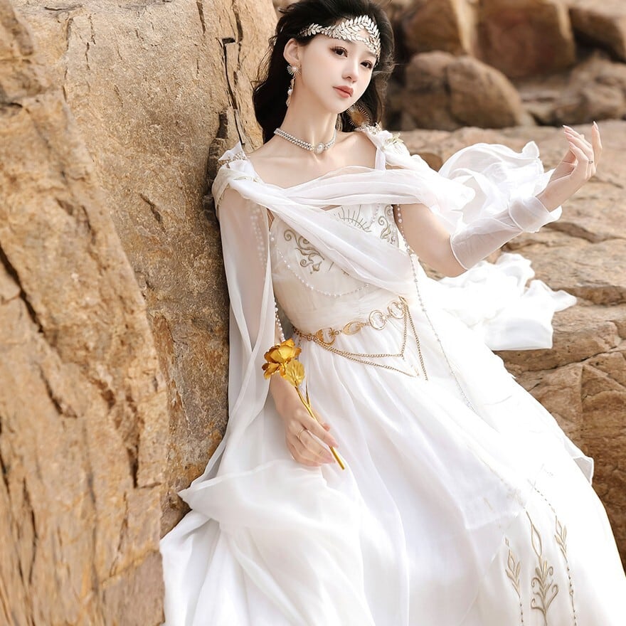 白い祈りをそのまま衣装に落とし込んだような、静謐で神秘的な一着です。揺れるケープと裾に宿る金の意匠が、光の中で儚さと格調を同時に引き立て、物語の中の巫女や聖女のような空気を纏わせます。