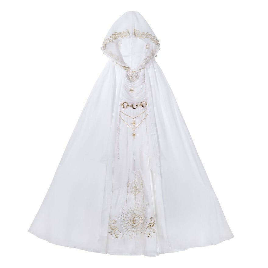 白を基調に金刺繍を添えたロングドレスとフード付きケープの組み合わせが特徴で、撮影会や幻想的なイベントで神秘的な存在感を纏いたい方に最適です。流れるような生地の重なりと静かな輝きが、澄んだ気品のある装いへ導いてくれます。