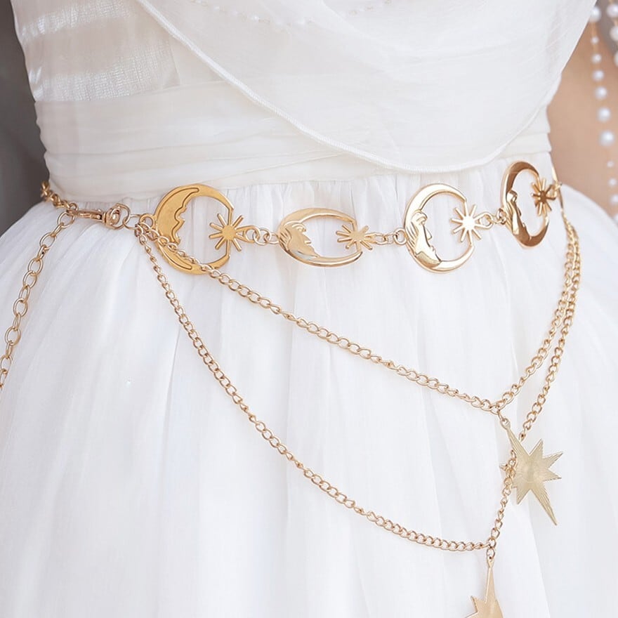 ・ウエスト:装飾ベルト風のディテールとチェーン使いが、シルエットにメリハリを加えています。