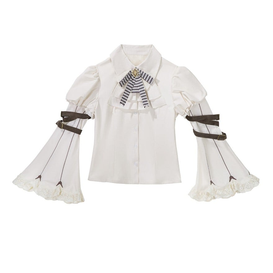 白×ブラウンの配色とコルセット風ベルト、ウエストポーチ風の装飾が特徴で、USJへのおでかけやイベントで物語性のあるコーデを楽しみたい方に最適です。姫袖の華やかさとクラシカルな装飾が重なり、気品のある王子系の雰囲気を一着で印象的にまとえます。