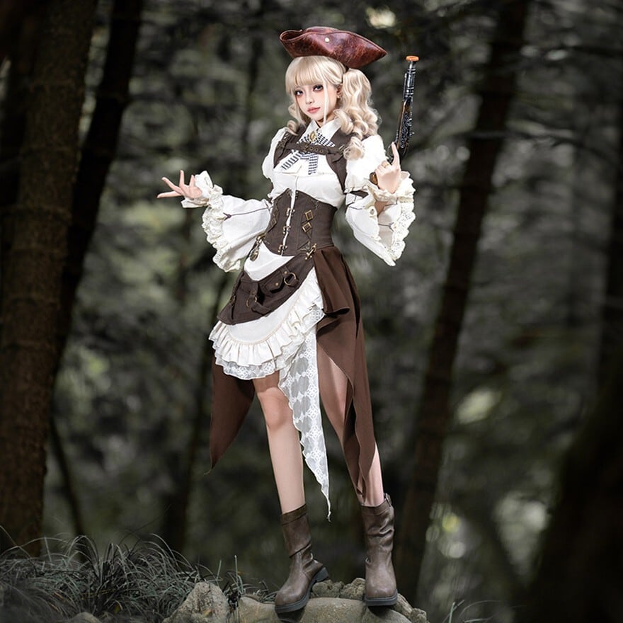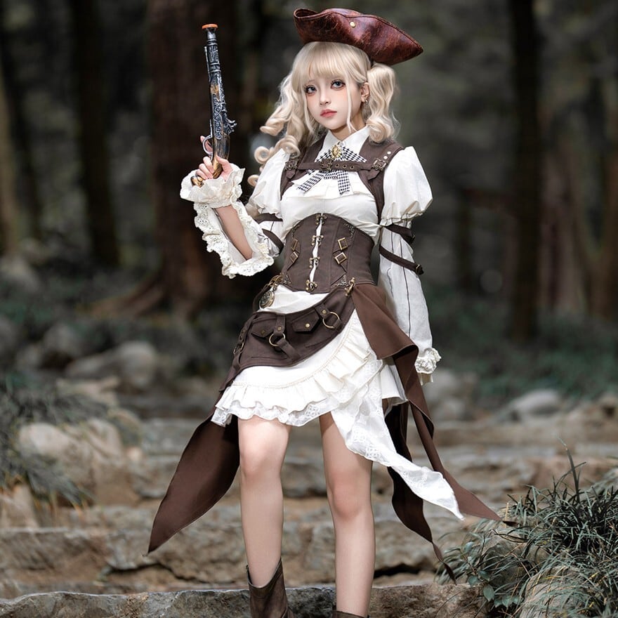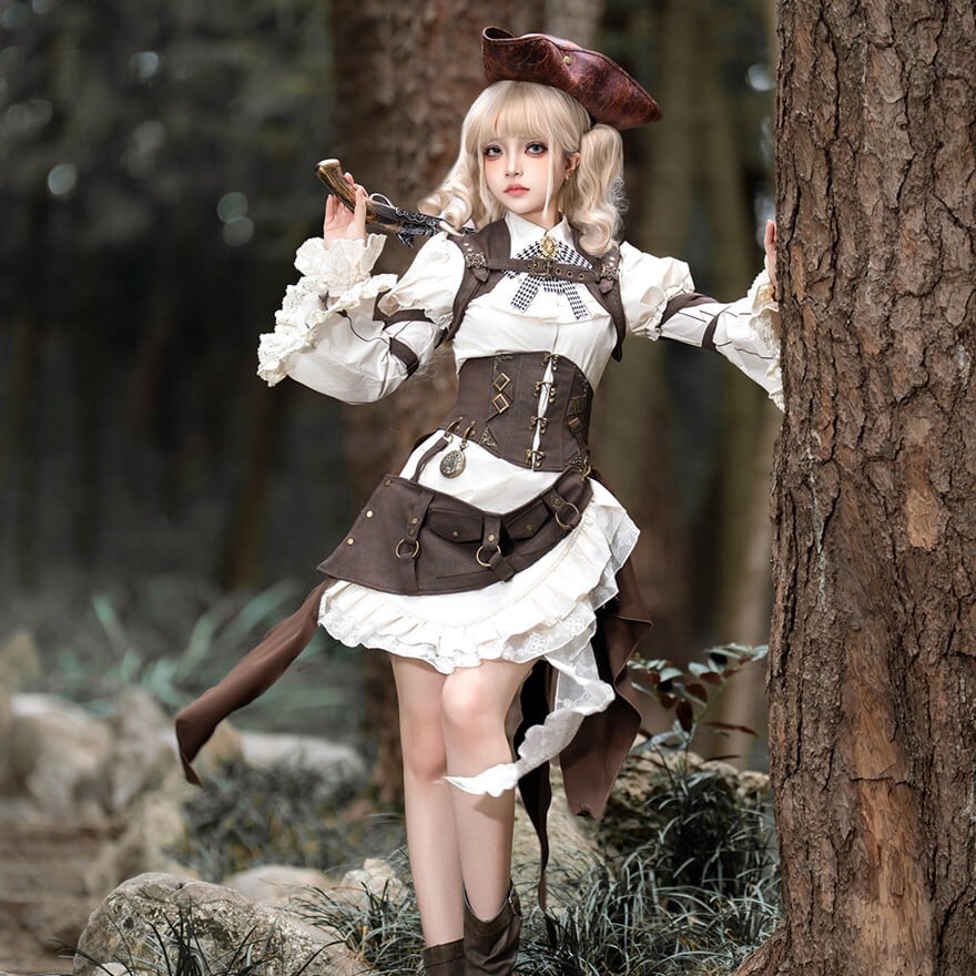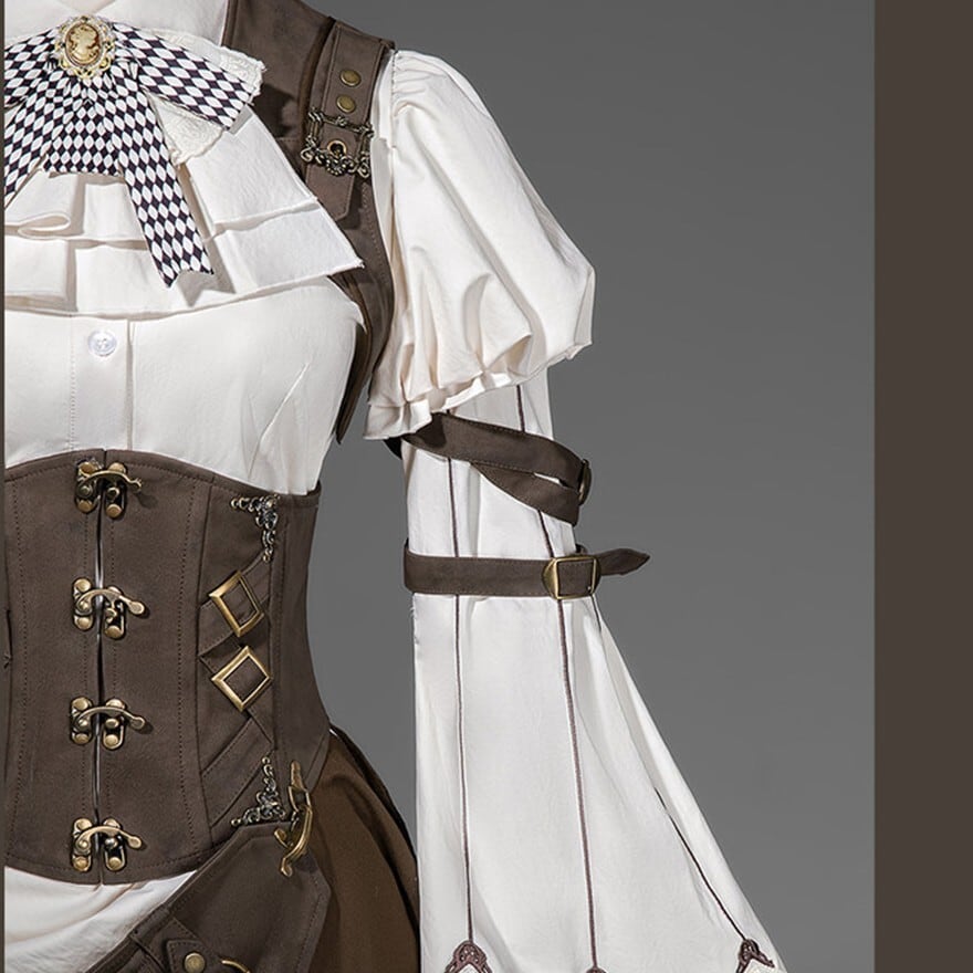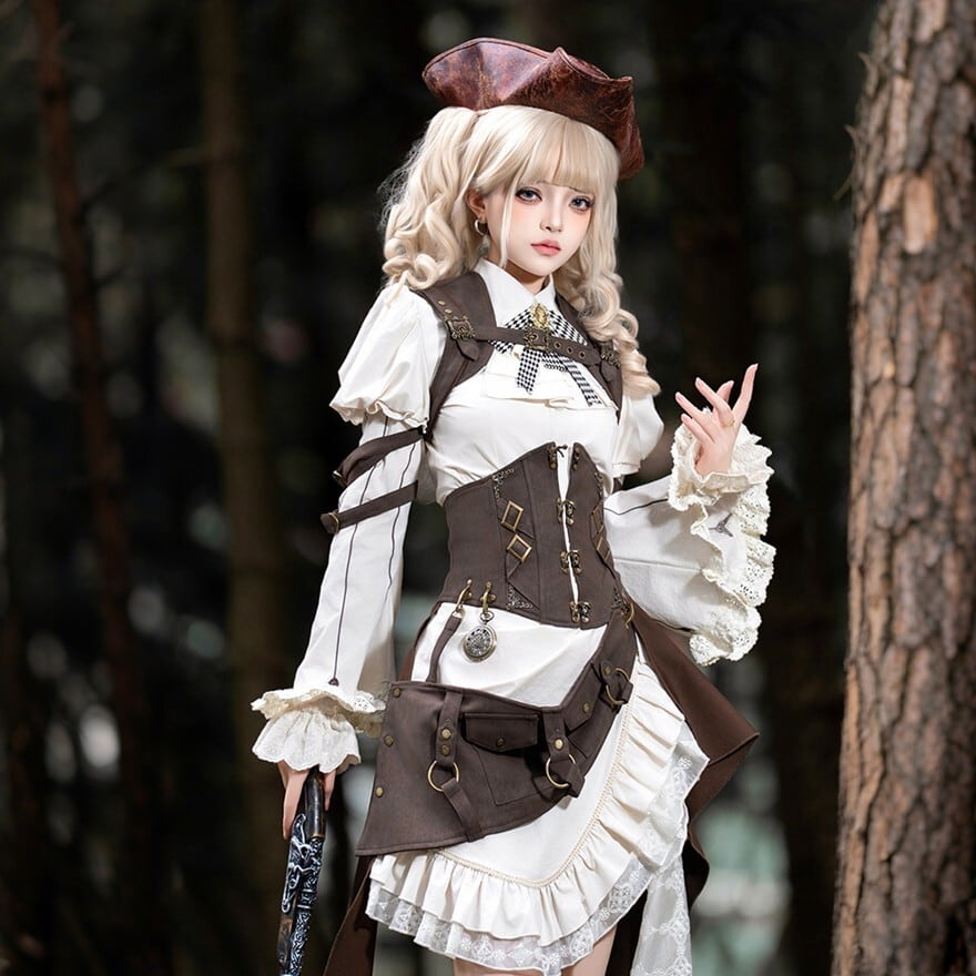 パンクやスチームパンクに惹かれるけれど、強すぎる印象だけには寄せたくない。そんな方にも取り入れやすいセットです。白ブラウスとフリルがやわらかさを添えながら、コルセット風のウエストまわりやポーチ、ベルト装飾が全体をしっかり引き締めるため、甘さと冒険感のバランスが取りやすくなっています。