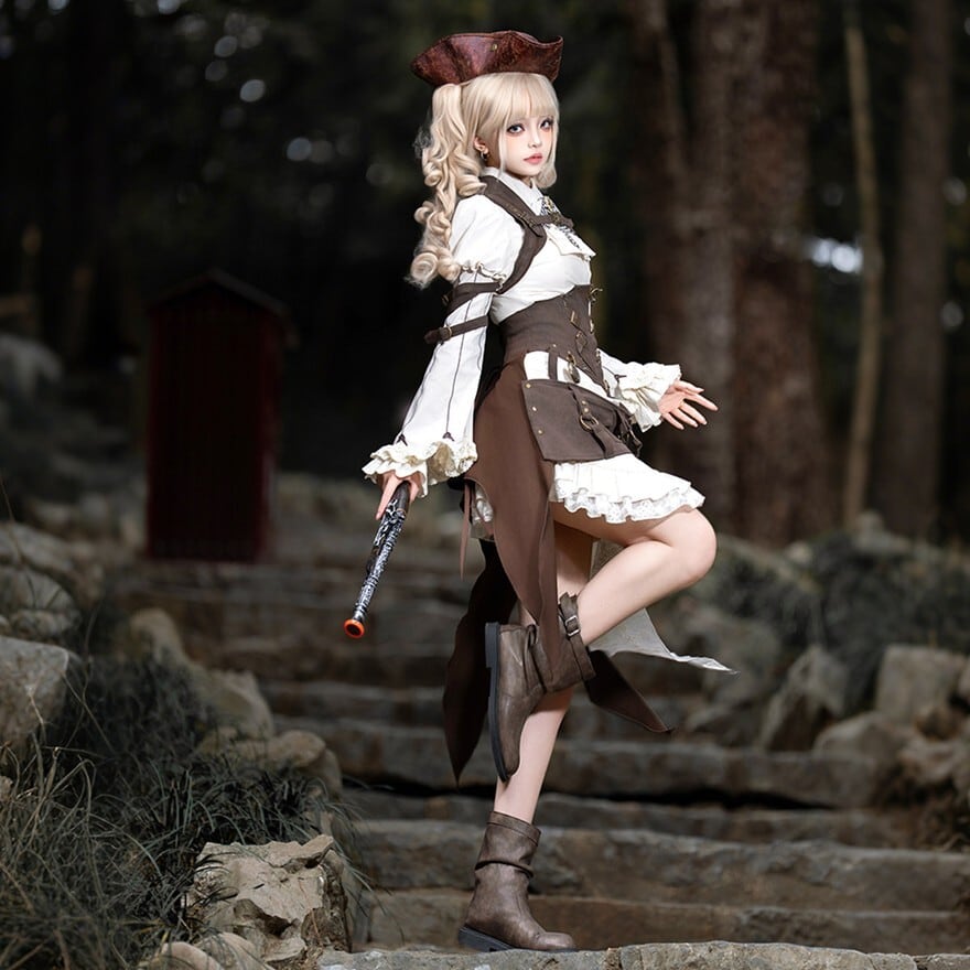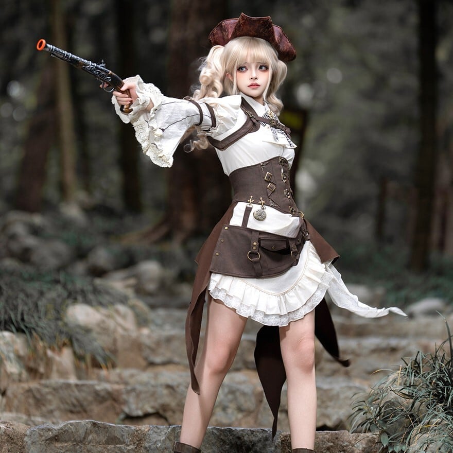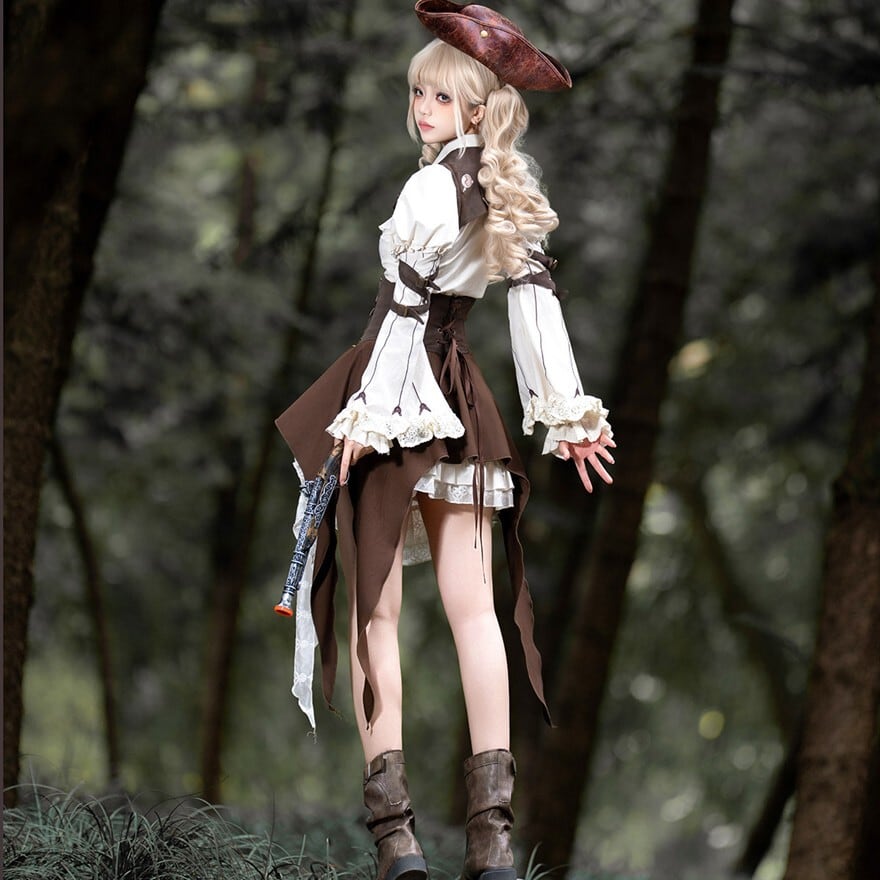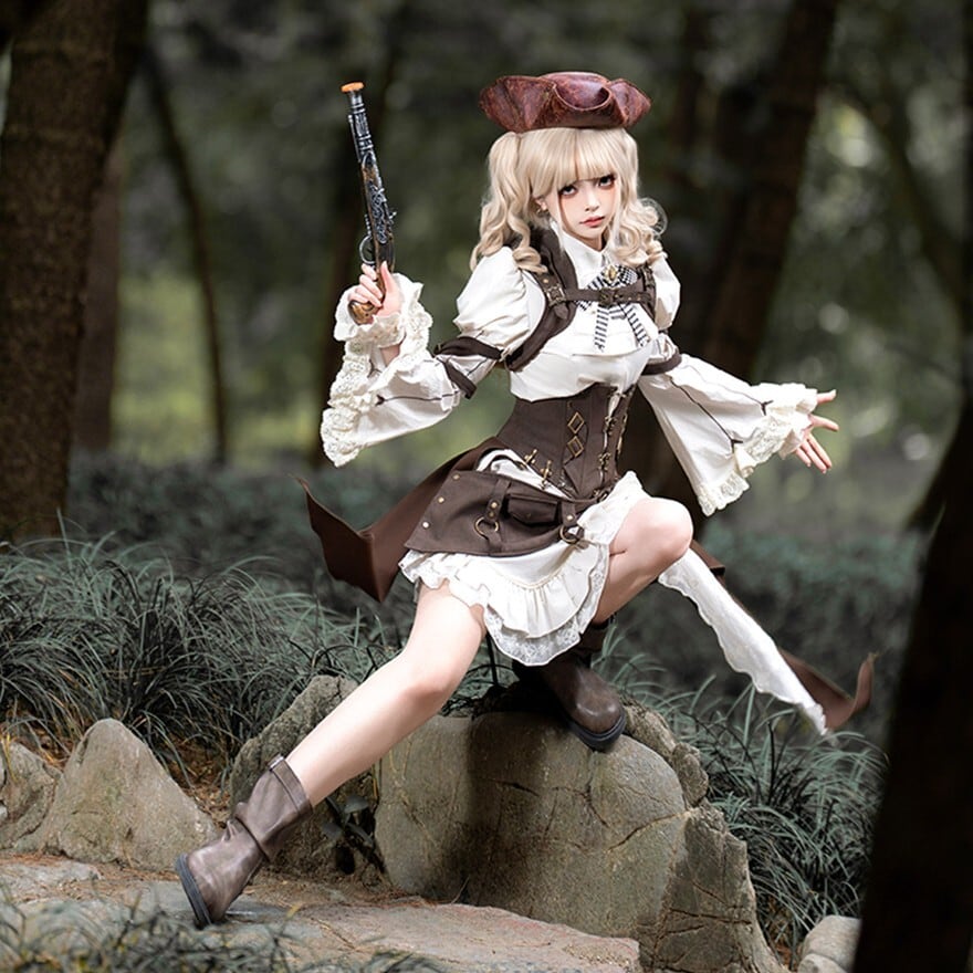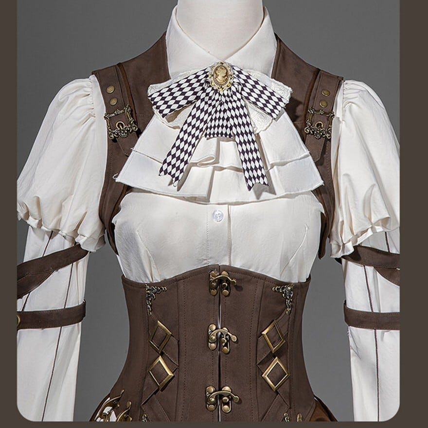 パンクやスチームパンクに惹かれるけれど、強すぎる印象だけには寄せたくない。そんな方にも取り入れやすいセットです。白ブラウスとフリルがやわらかさを添えながら、コルセット風のウエストまわりやポーチ、ベルト装飾が全体をしっかり引き締めるため、甘さと冒険感のバランスが取りやすくなっています。