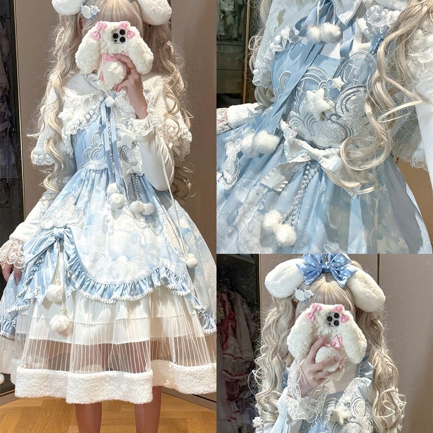 ブルー×ホワイトの配色とケープ付きジャンパースカートの組み合わせが特徴で、お茶会や撮影会でプリンセスのような甘ロリコーデを楽しみたい方に最適です。ふんわり重なる裾とやわらかな配色が重なり、一式で統一感のある華やかな装いに整います。