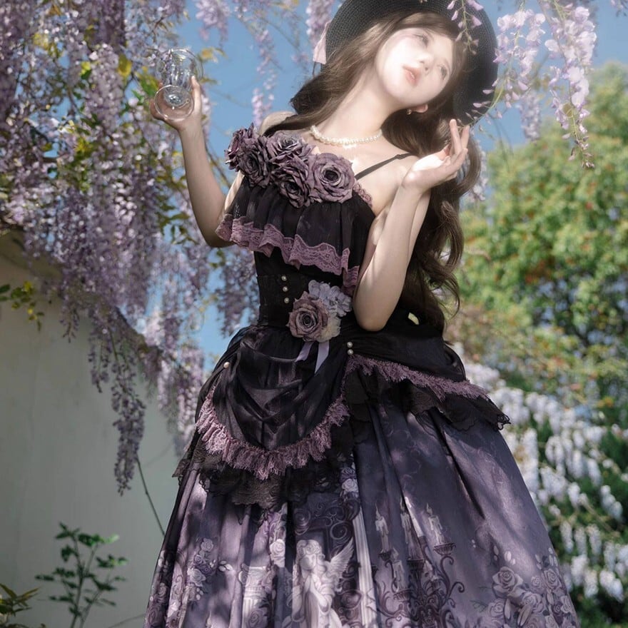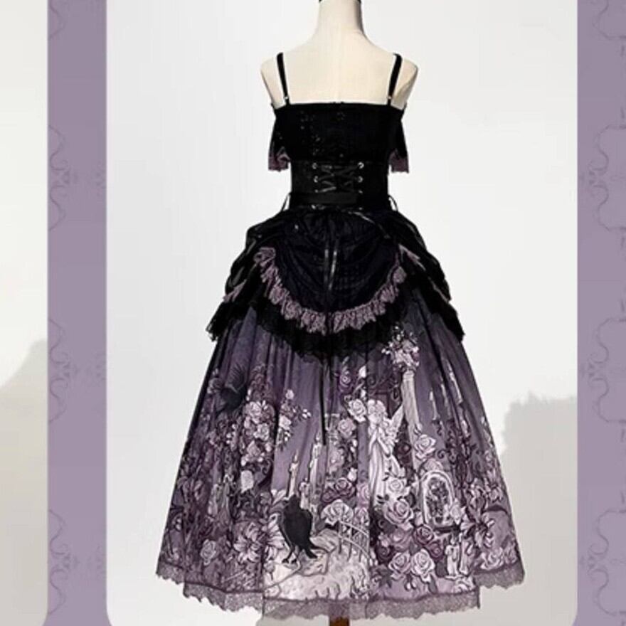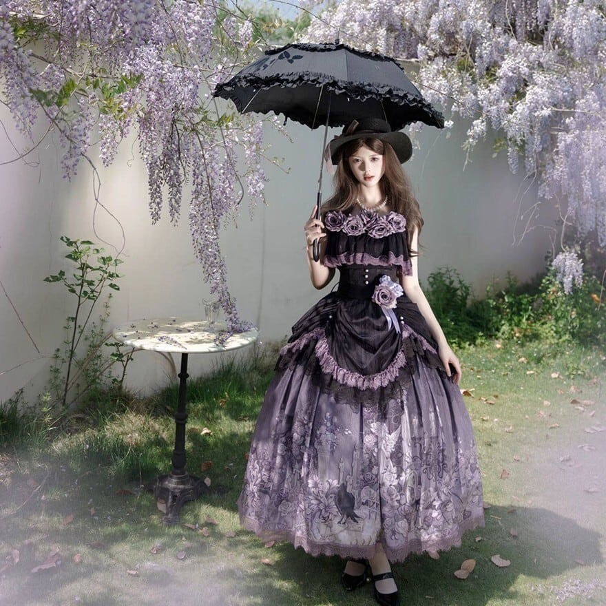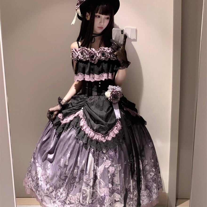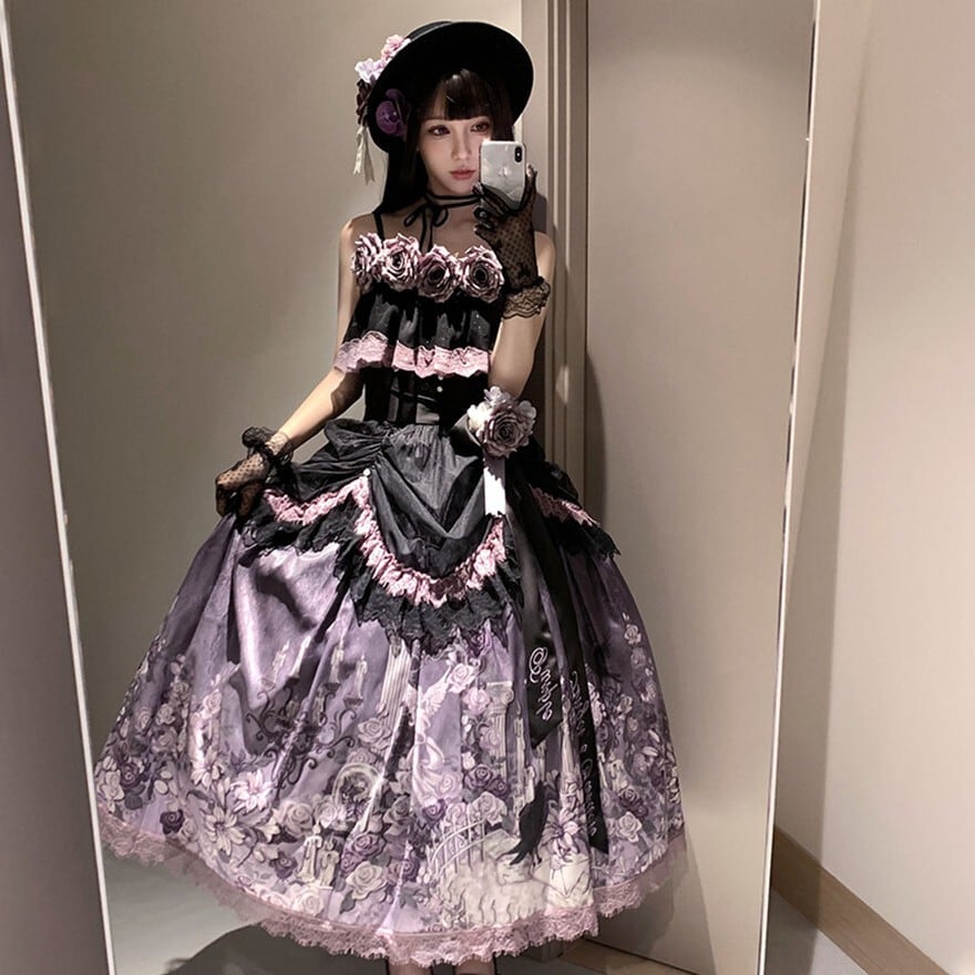 ゴシックなコーデを選びたいけれど、重たく見えすぎるのは避けたい。そんな方にも取り入れやすいセットです。上半身はキャミソールのフリルと薔薇モチーフで華やかに見せながら、スカートには庭園を思わせる柄と落ち着いた紫を重ねているため、印象が強すぎず上品にまとまります。セットで着るだけで、統一感のある世界観コーデを作りやすいのも魅力です。