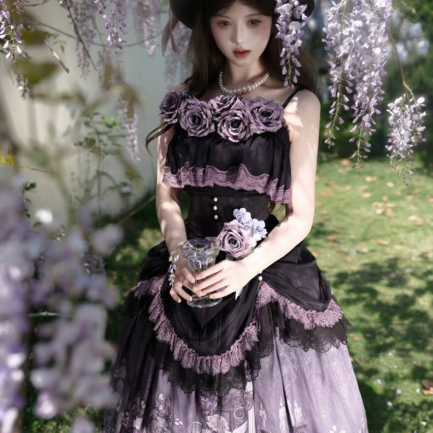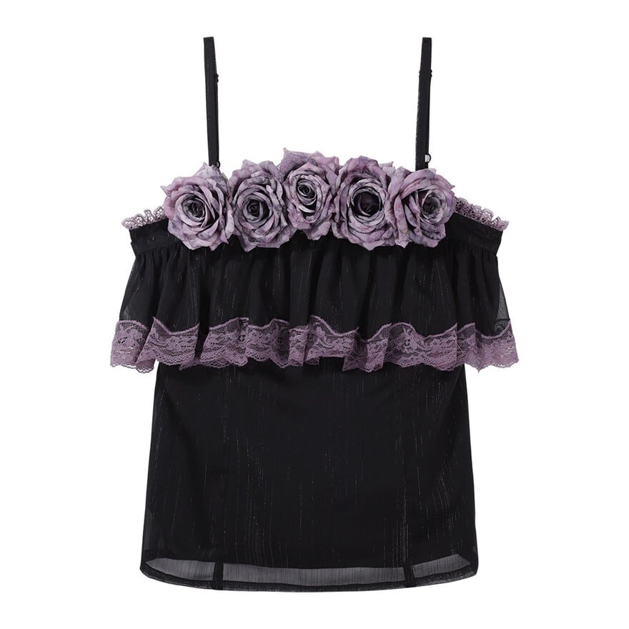 黒×紫の配色と薔薇モチーフを飾ったキャミソールが特徴で、撮影会やゴシックイベントで庭園のように耽美な世界観を纏いたい方に最適です。華やかな柄スカートと重なることで、気品と物語性のある装いに整います。