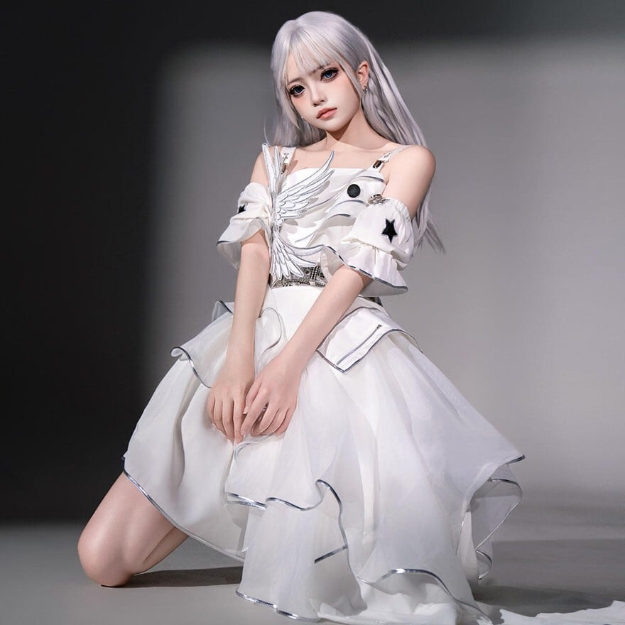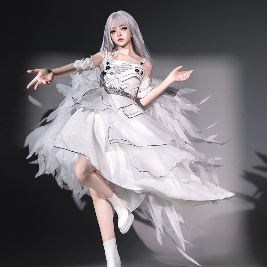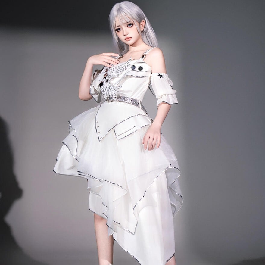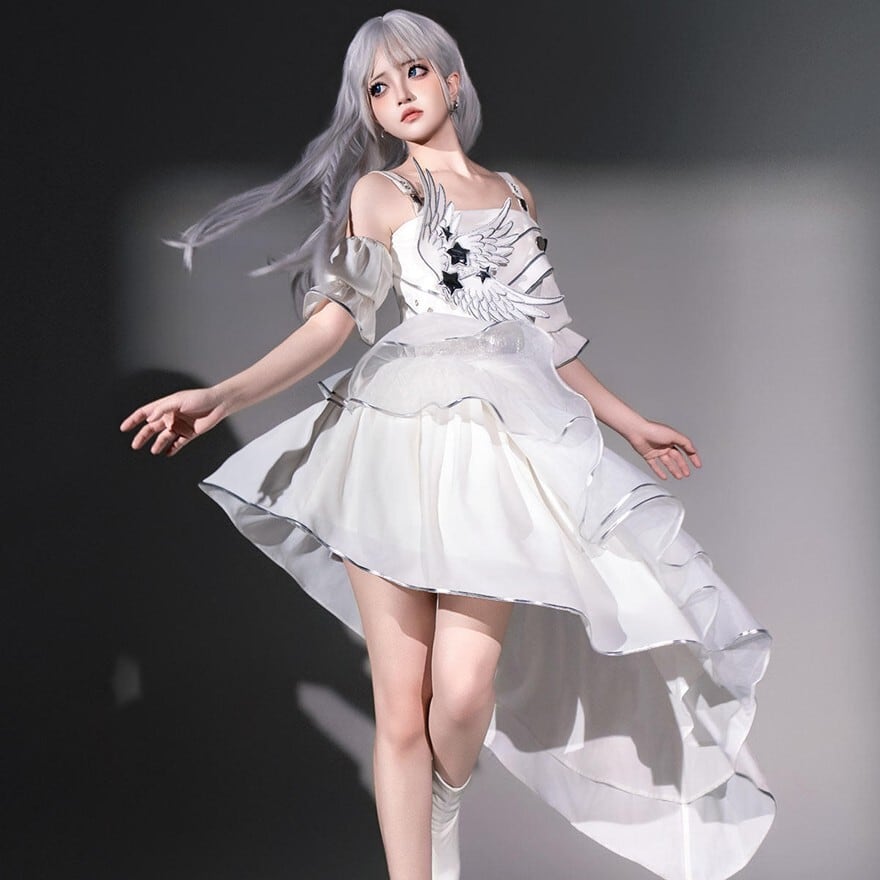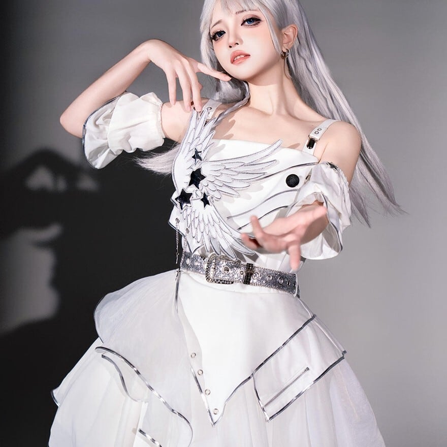 翼モチーフとアシメヘムが特徴で、撮影会やイベントで神秘的な存在感を纏いたい方に最適です。スリーブカバーを重ねることで動きのある白コーデが完成し、軽やかさと印象的な華やかさを一着で楽しめます。