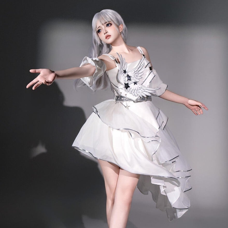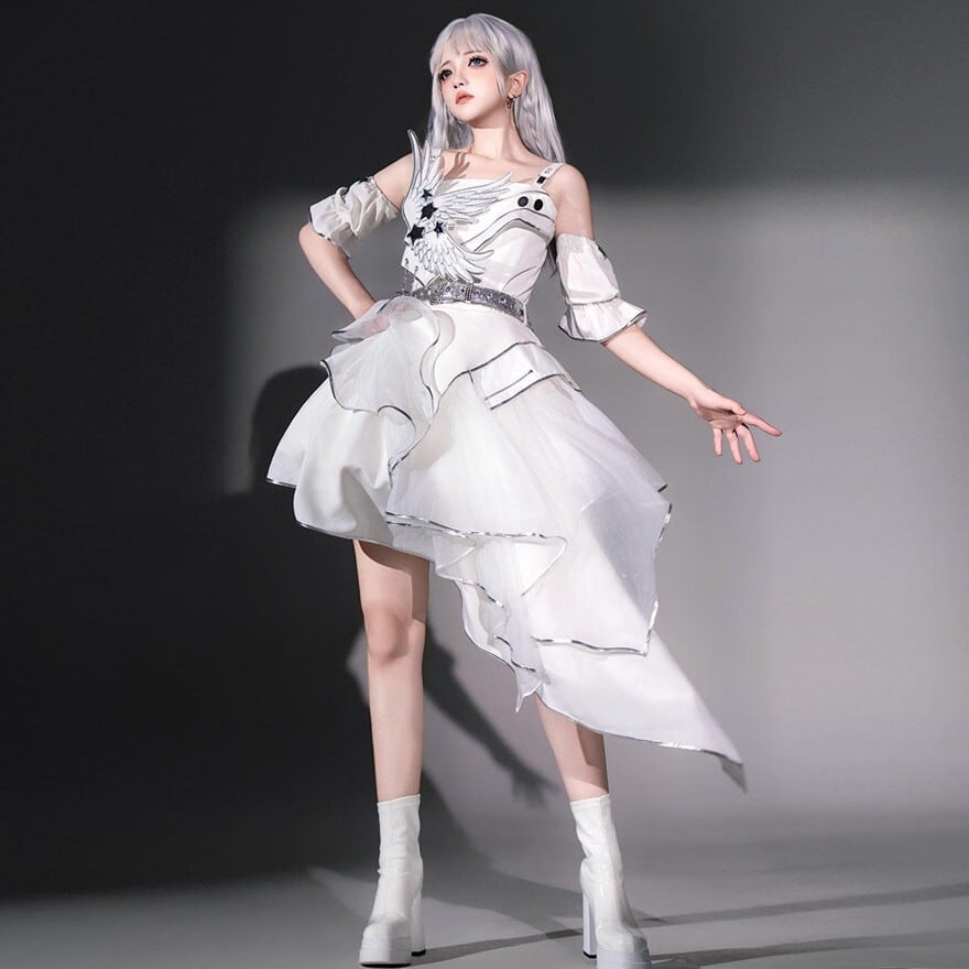 白系の衣装は印象が淡くなりやすい、けれど重たく見えない華やかさは欲しい。そんな方にも取り入れやすいドレスです。胸元の翼モチーフがしっかり視線を集め、前後差のある裾が動きのあるシルエットを作るため、軽やかさを保ちながらも舞台映えする存在感を整えやすくなっています。