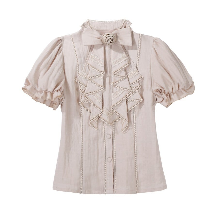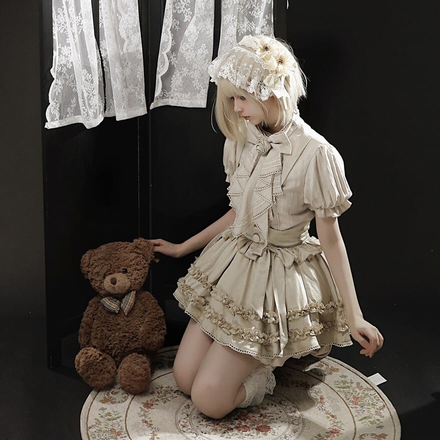 古い洋書の中から抜け出してきたような、静かな物語性を宿した一着です。やわらかなベージュに重なるフリルとリボンが、アンティークドールのような可憐さと、王子系らしい端正な気配をそっと引き立てます。