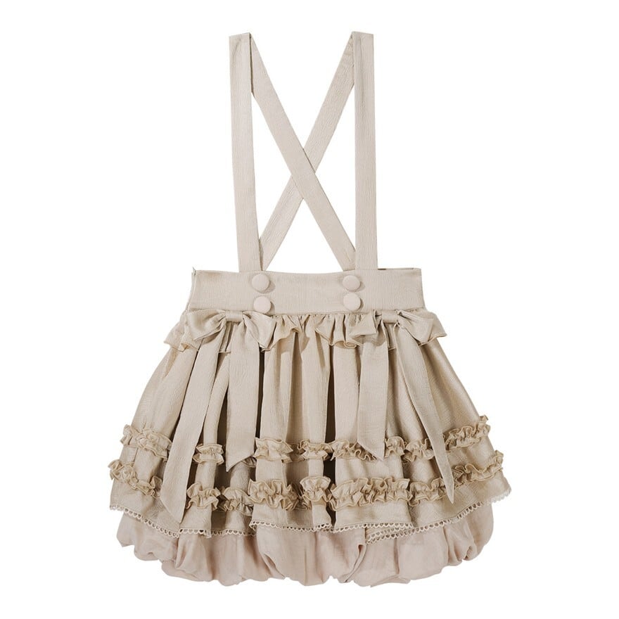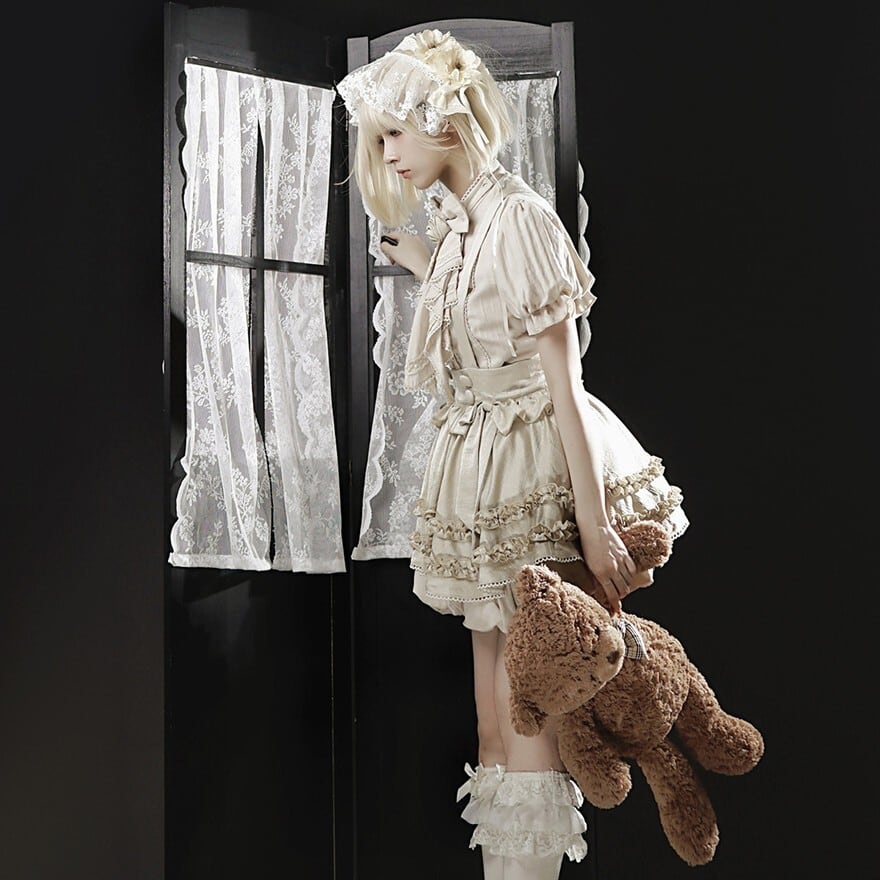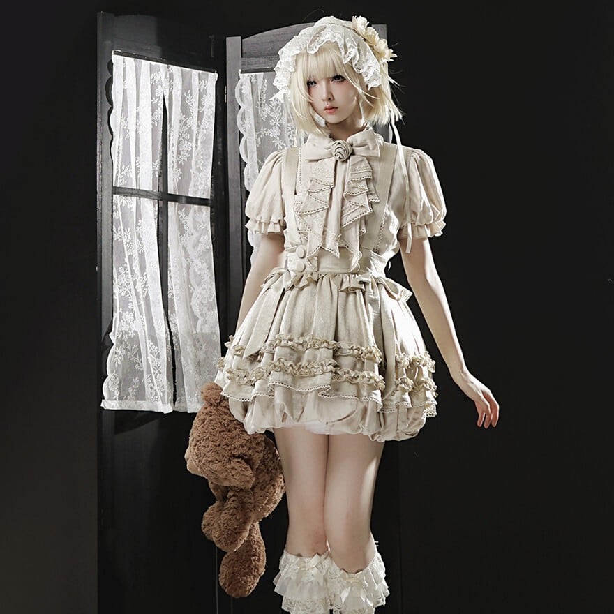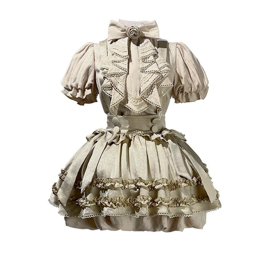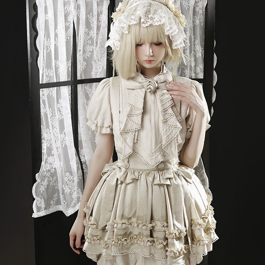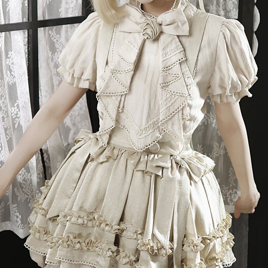 ベージュを基調にフリルブラウスとサスペンダースカートを重ねたデザインが特徴で、クラシカルなおでかけコーデを楽しみたい方に最適です。やわらかな色味と立体的なフリルが重なり、甘さの中にも気品を感じる王子系の空気を印象的に纏えます。