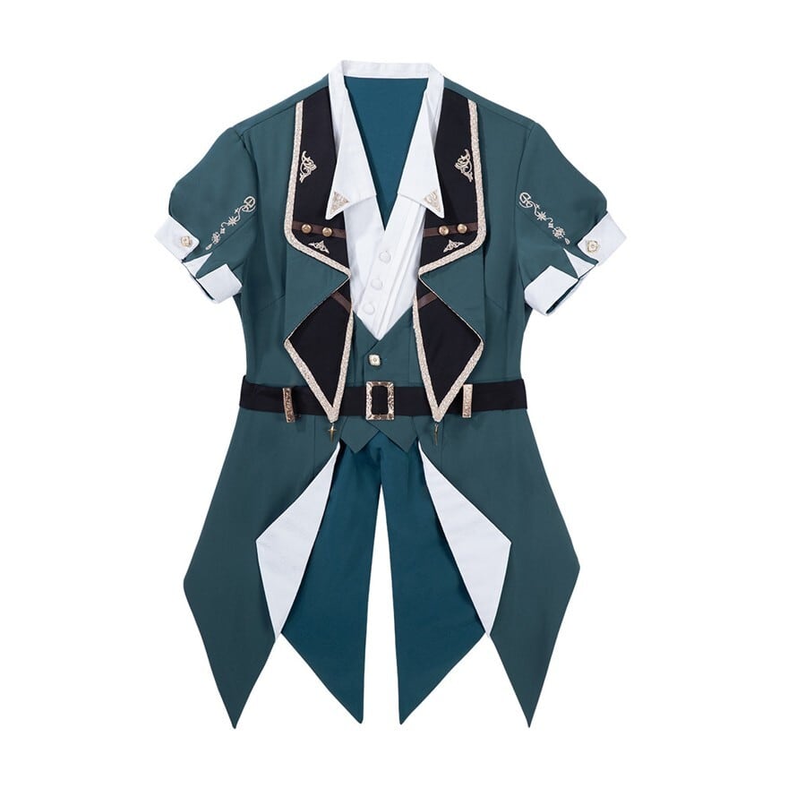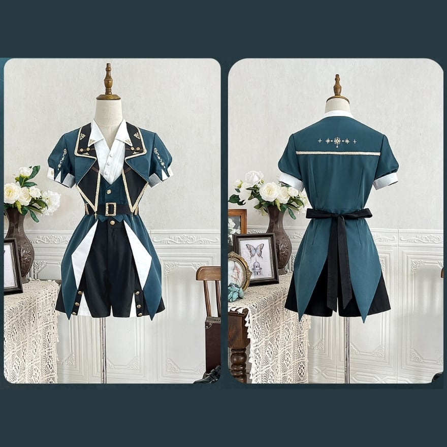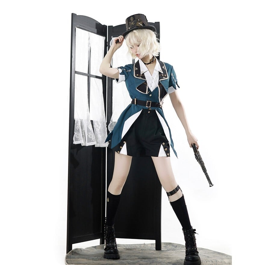 軍服風の端正なトップスとショートパンツの組み合わせが特徴で、撮影会やイベントで冒険感のあるクラシカルコーデを楽しみたい方に最適です。グリーン、ブラック、ホワイトの配色に金具風の装飾が重なり、凛とした存在感のある装いに整います。