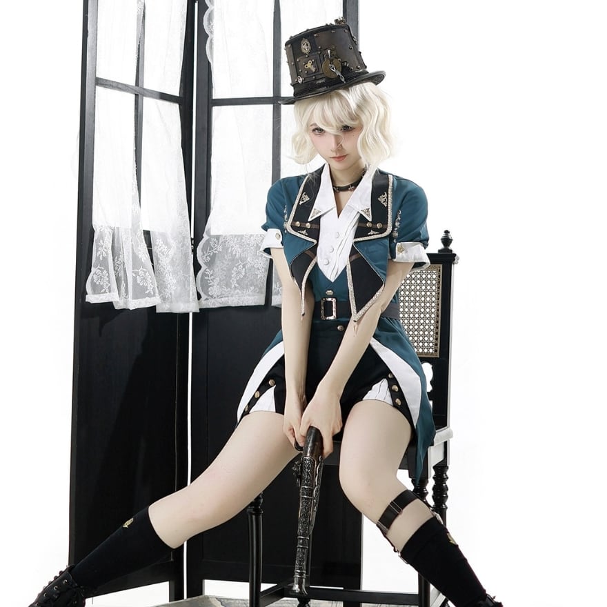 スチームパンクは好きだけれど、重たく見えすぎたり、装飾だけが強く見えるコーデにはしたくない。そんな方にも取り入れやすいセットです。襟元やフロントの端正なラインが全体をきちんと見せながら、金具風ディテールや配色の切り替えがしっかりアクセントになるため、辛口すぎず上品な軍服風スタイルにまとまります。
