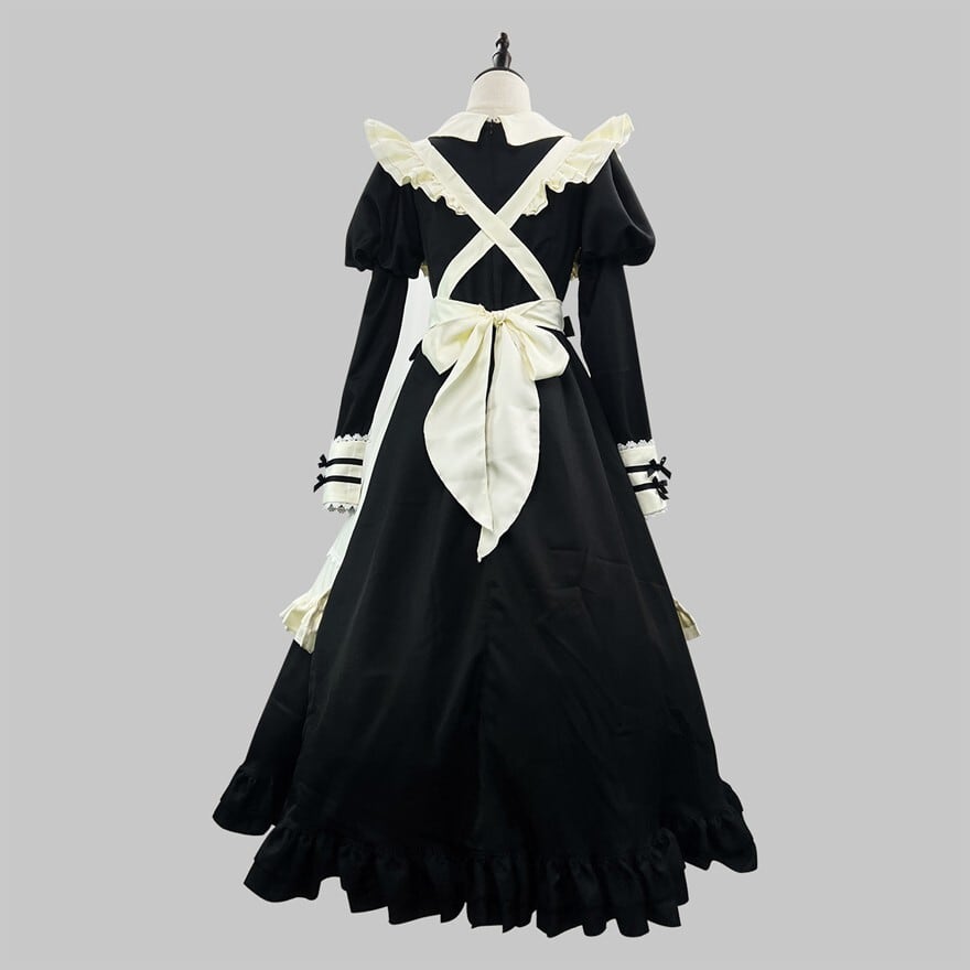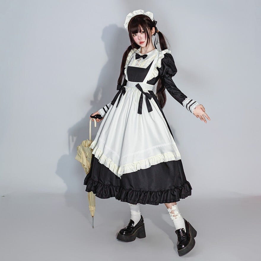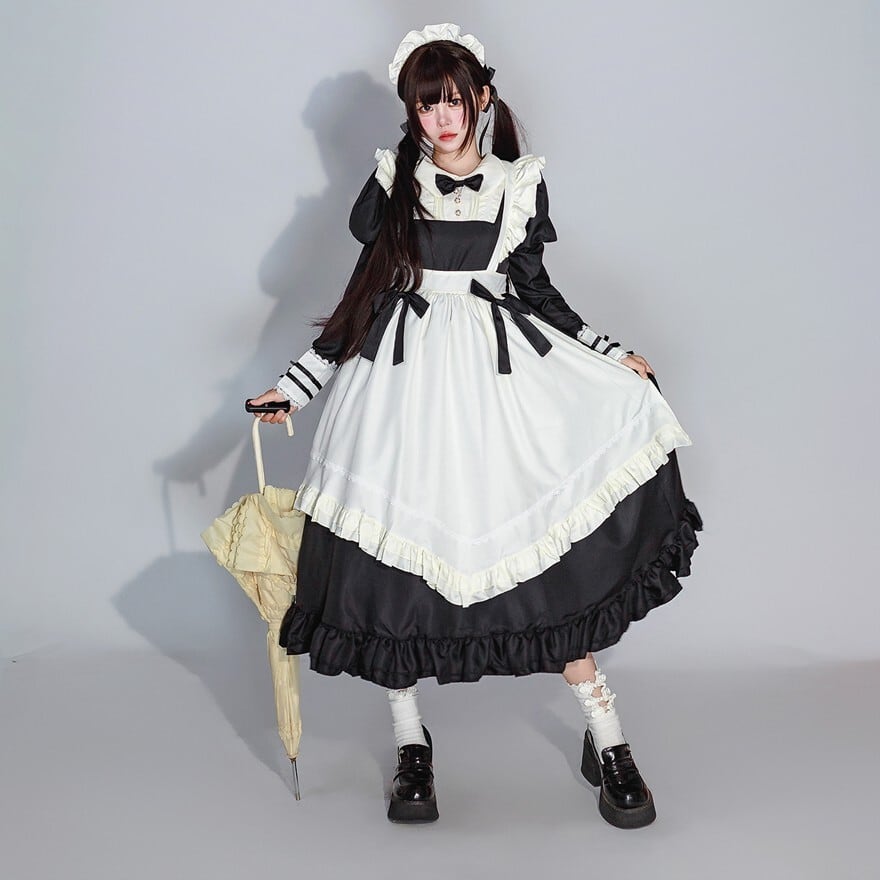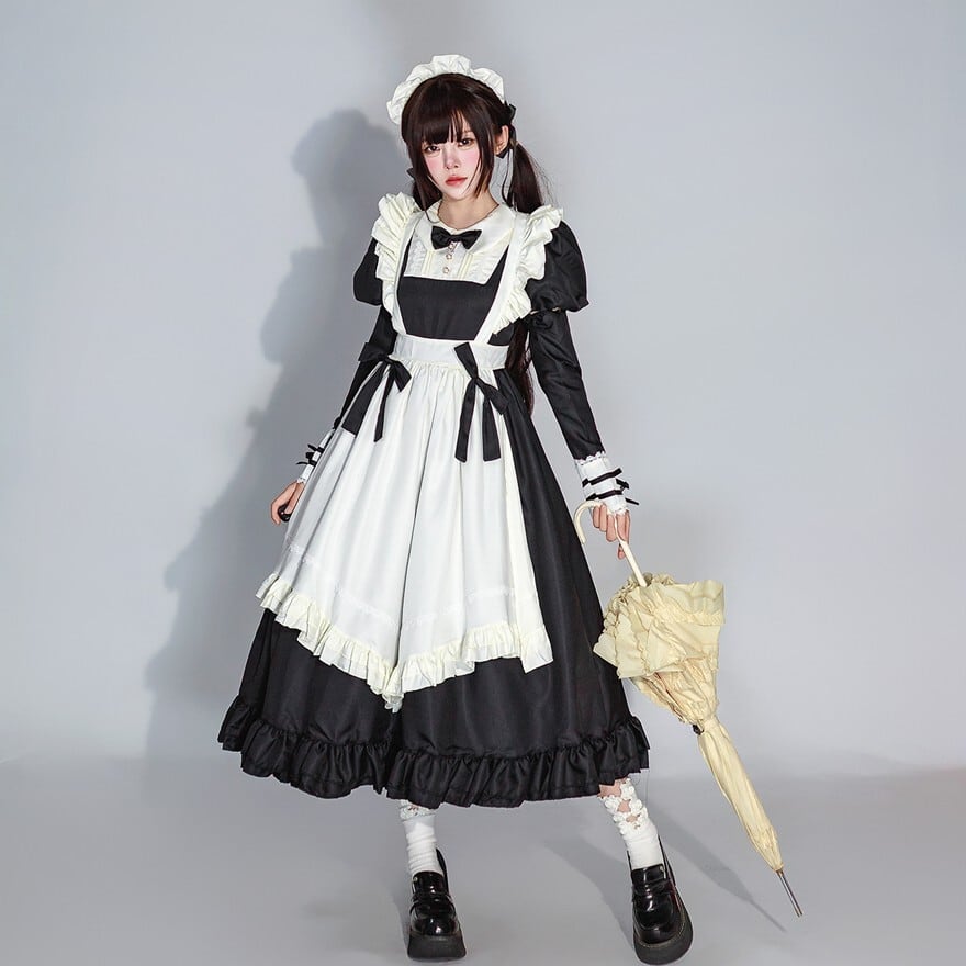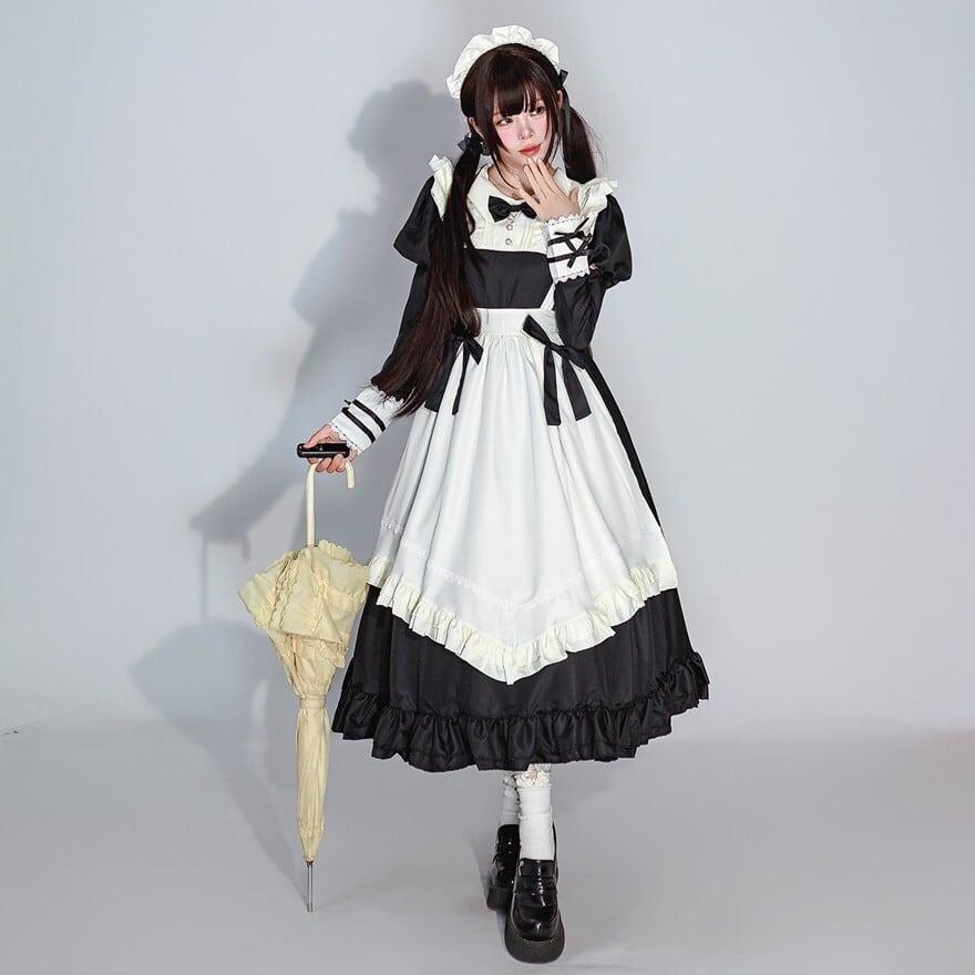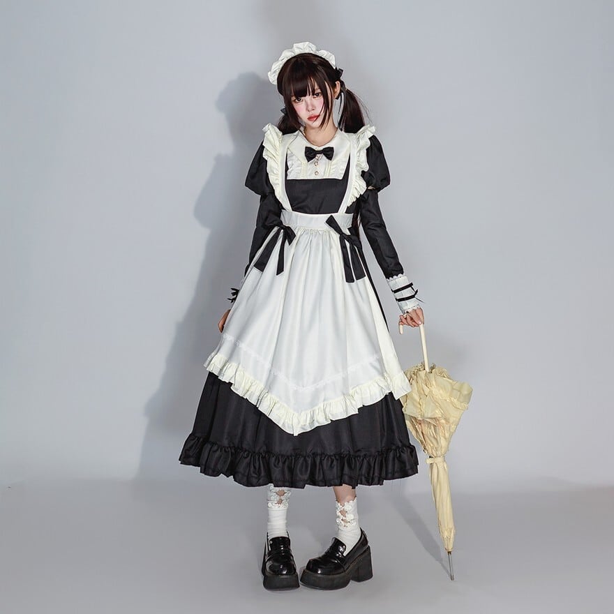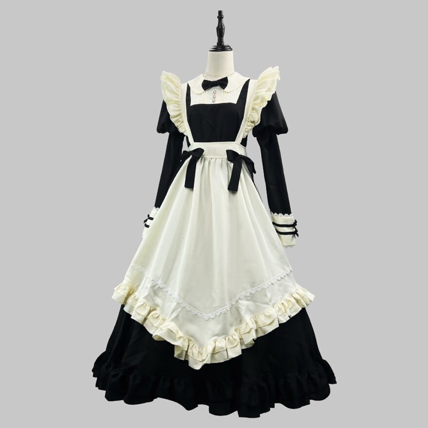 ヴィクトリアン風のロング丈と黒白の配色が特徴で、撮影会やイベントでクラシカルなメイドコーデを楽しみたい方に最適です。長めのシルエットとフリルの重なりが、可憐さの中に静かな気品を添えてくれます。