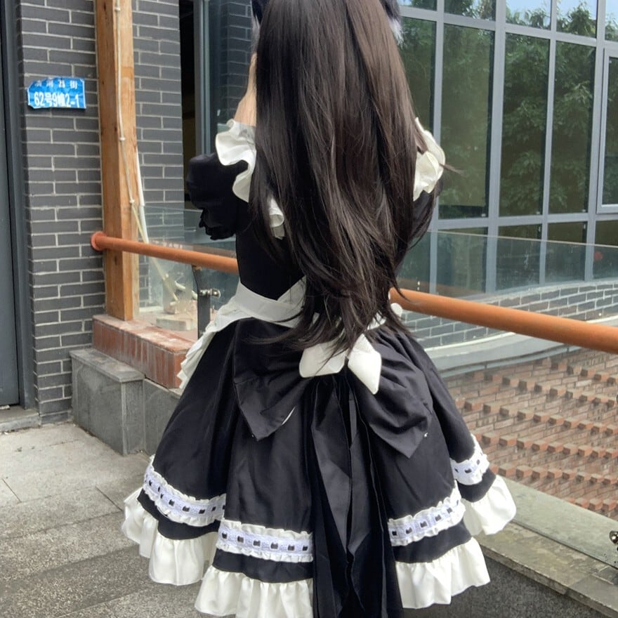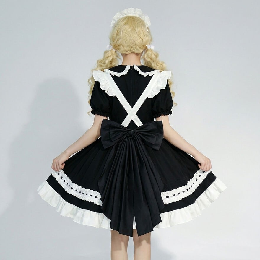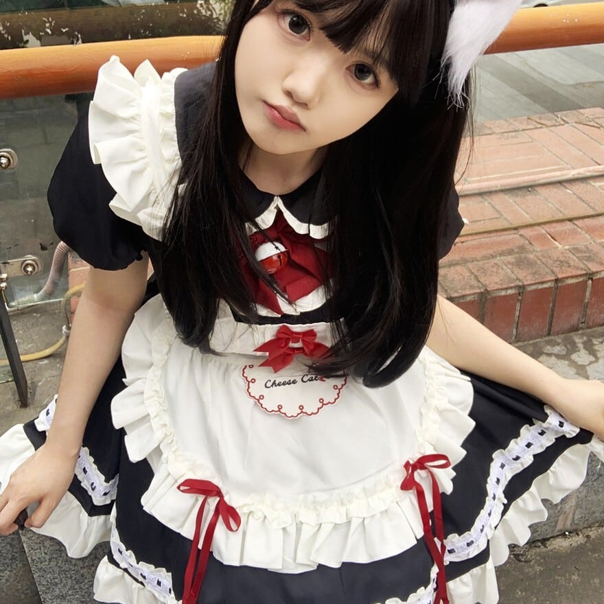 ブラックを基調にホワイトのエプロン風デザインとレッドリボンを重ねた配色が特徴で、撮影会やイベントで可憐さと退廃感の両方を楽しみたい方に最適です。ミニ丈の軽やかさに整ったフリル使いが重なり、王道感がありながらも印象的なメイドコーデに整います。