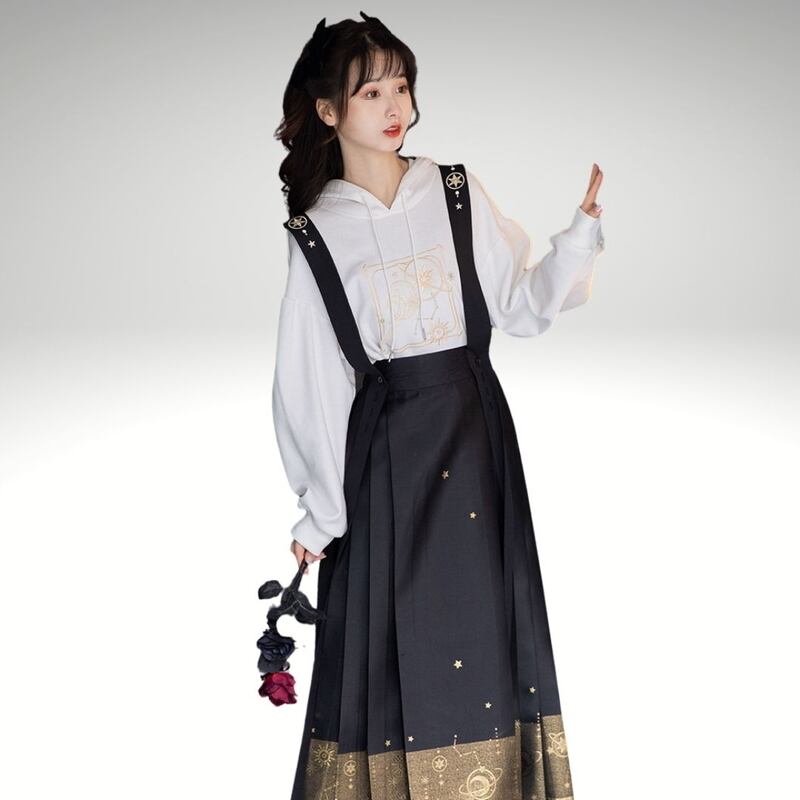 星と月をイメージしたプルオーバーパーカーにハイウエストプリーツのロングサスペンダースカート