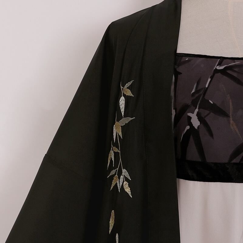 ハイウエスト、ロング丈のシフォンスカートに竹刺繍がおしゃれな羽織りの2点セットです。