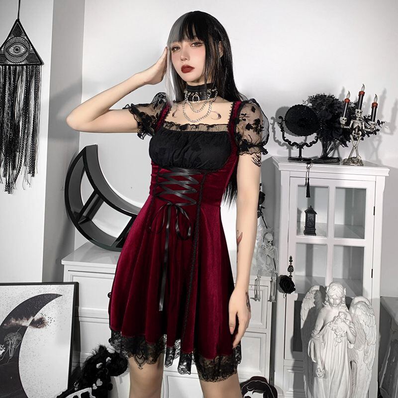 ゴスロリ通販 With U ドレス ワンピース ミニ丈 半袖 レース コルセット レースアップ ゴスロリ ストリート系 病みかわいい バンギャ ゴスロリ ゴスロリ服 病み服