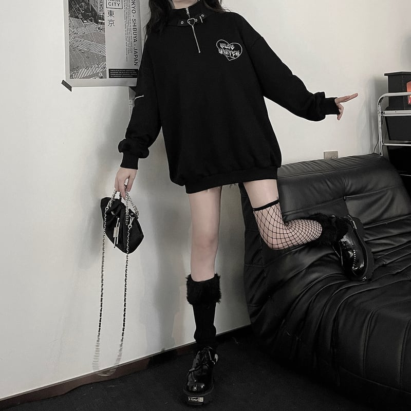 ゴスロリ通販 With U CRAZYGIRL セーター ロング丈 ZIP 刺繍 ハート 病み可愛い ゴスロリ系 JKファッション ストリート系 地雷系 ゴスロリ系 ゴスロリ服 病み服