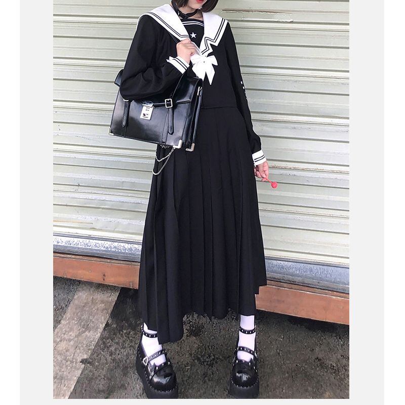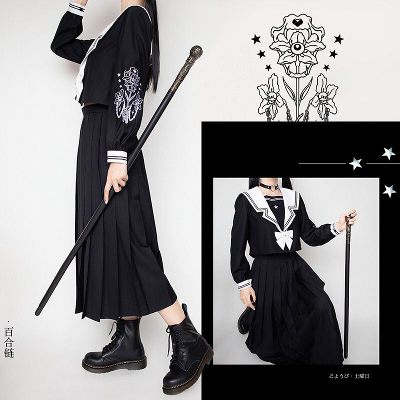 ゴスロリ通販 With U セーラー服 長袖 刺繍 リボン ショート丈 ロングスカート セット レースアップ ゴスロリ 病みかわいい コスプレ 学生 制服 JC JK ゴスロリ服 病み服