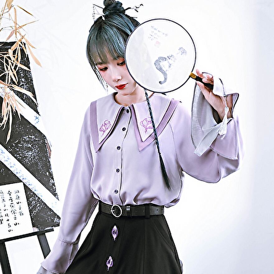 ゴスロリ通販 With U チャイナ風 ゴシック 古怪舎長袖シャツ トランペットスリーブ 刺繍 パステルカラー 中華風 ゴスロリ JK 可愛い ゴスロリ服 病み服
