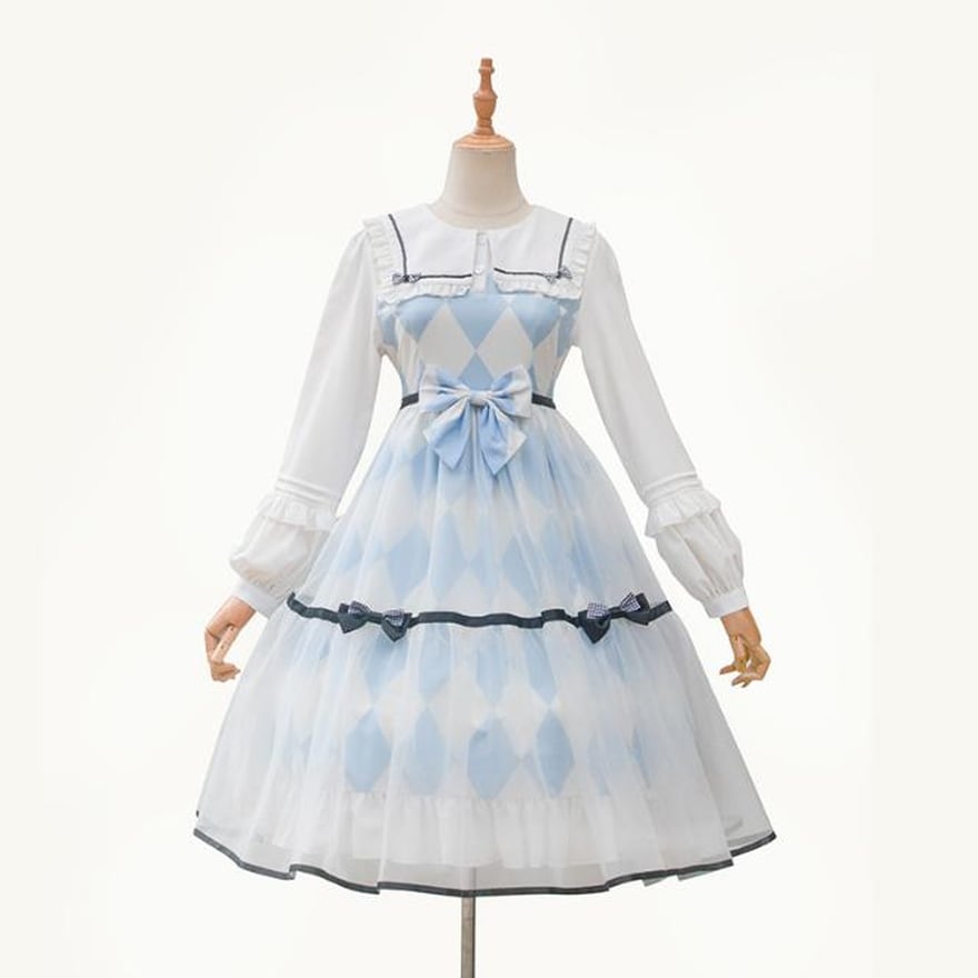 ゴスロリ通販 With U 甘 Alice ワンピース ミドル丈 ブルー アーガイル柄 うさ耳 リボン 夢かわいい