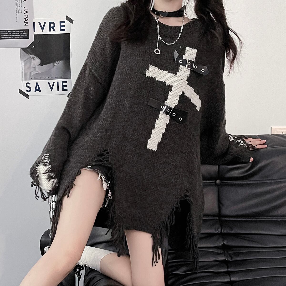ゴスロリ通販 With U ゴシック ロリィタ CRAZYGIRL セーター 長袖 十字架 ダメージ フリンジ ベルト ストリート 病みかわ バンギャ 甘ロリ