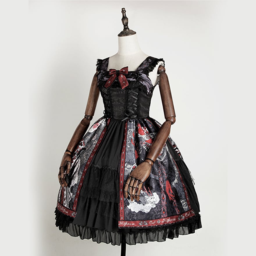 ゴスロリ通販 With U ゴシック ロリィタ ワンピース ノースリーブ リボン レース フリル 柄 プリント イラスト ハイウエスト スカート ダーク ミドル丈
