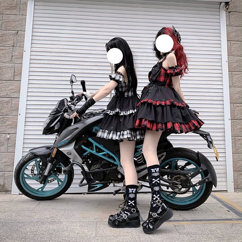 ゴスロリ通販 With U アイドル ゴスロリ ワンピ ジャンパースカート チェック柄 ミニ丈 レース編上げ ストリート系 ハードガール 原宿系 地雷系