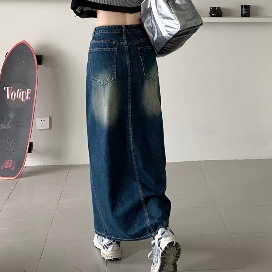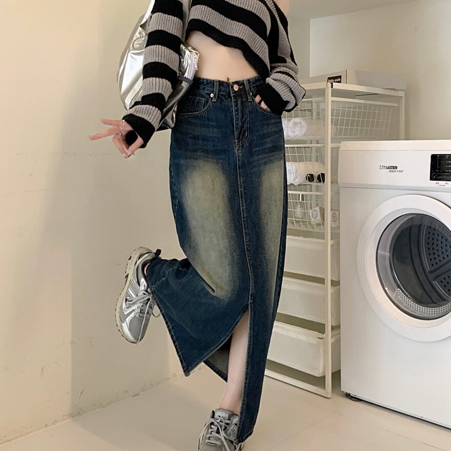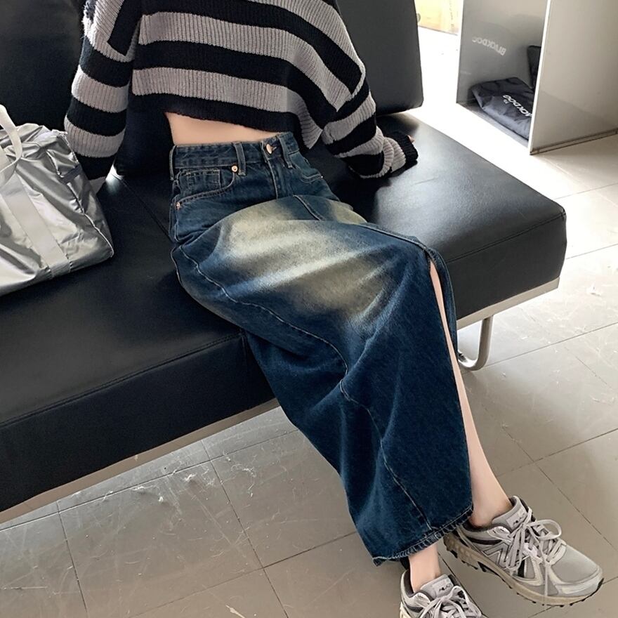 ゴスロリ通販 With U ゴシック ロリィタ デニム スカート ウォッシュド Aライン スリット入り ストレートスカート 原宿ファッション 韓国ファッション かわいい 甘め