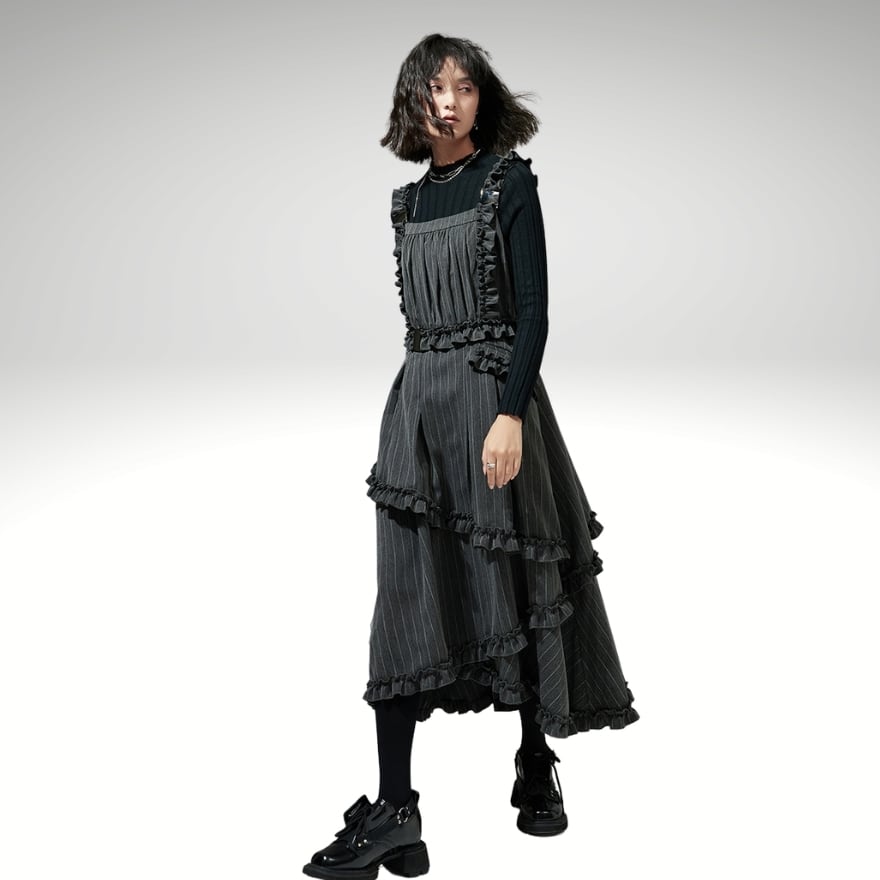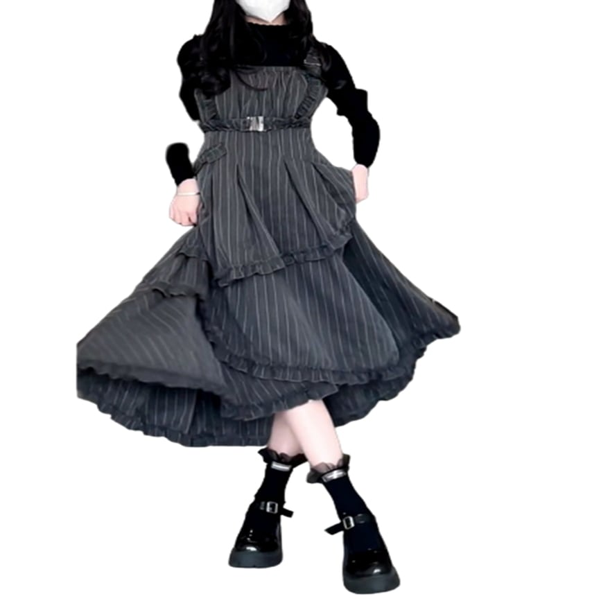 ゴスロリ通販 With U ゴスロリ ツーピース ニット スリムフィット ジャンパースカート ストライプ フリル ロング丈 病み可愛い 高見世 大人