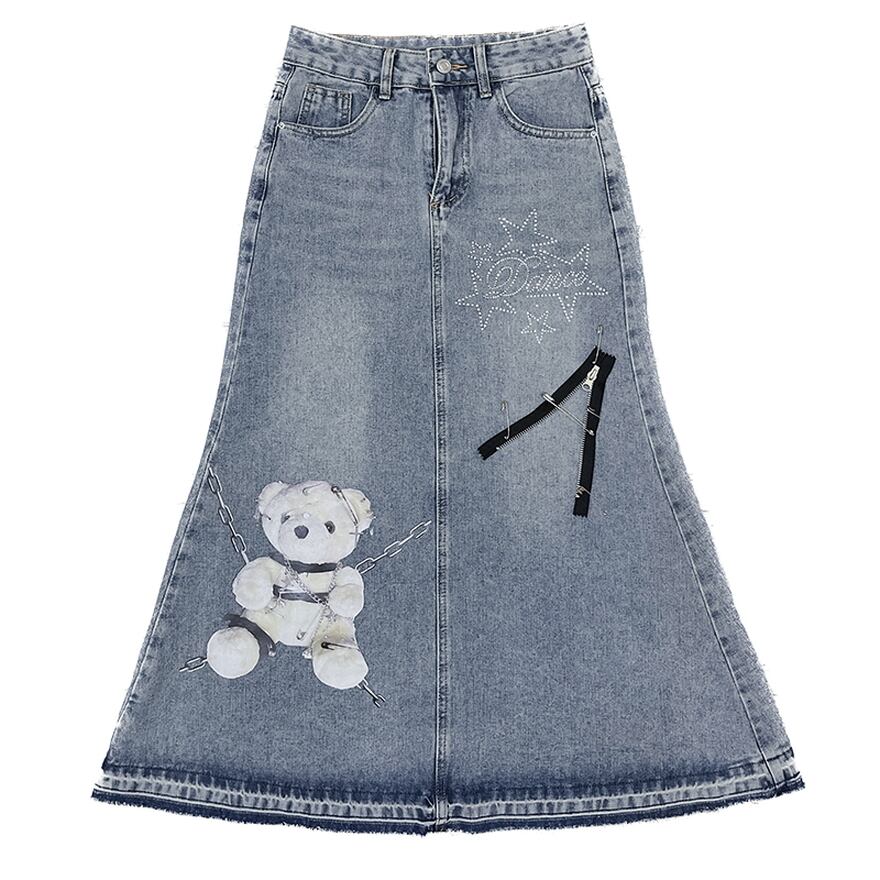 ハイウエストロング丈のデニムにスタッズ、安全ピン、くまちゃんが装飾されたロングスカートです