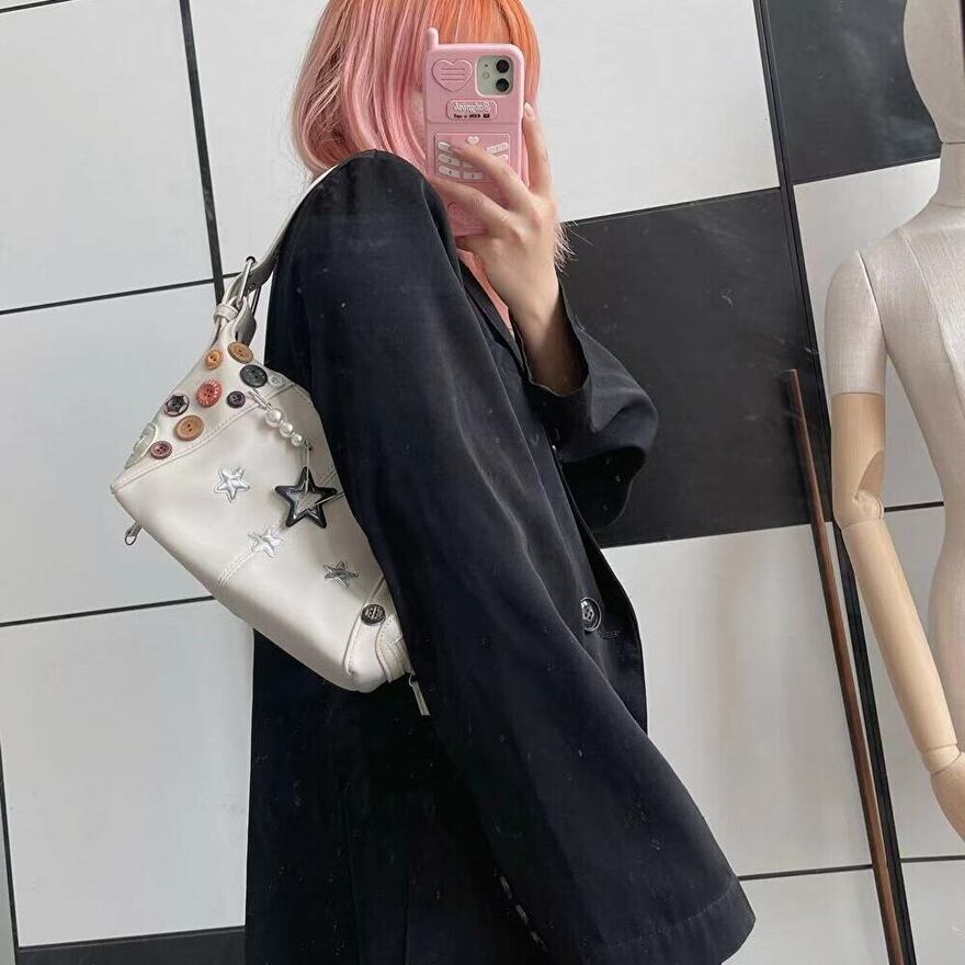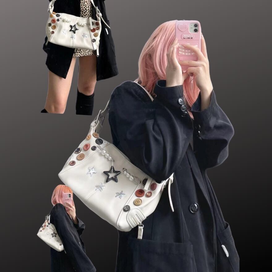 ゴスロリ通販 With U ゴシック ロリィタ ショルダーバッグ ソフトレザー レトロ 安全ピン ボタン 星ワッペン ストリート系 原宿ファッション