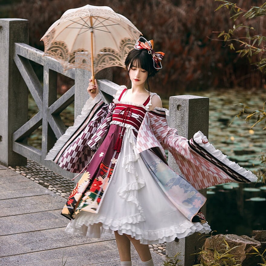 縁起物のヤガスリ柄がどこか懐かしい大正浪漫をイメージした和ロリの羽織りとスカート、チェストタッセルのセットです