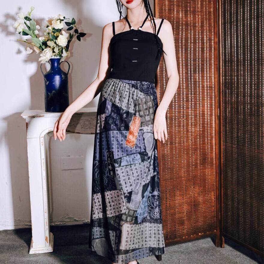 ゴスロリ通販 With U チャイナ風 ゴシック 古怪舎 鏡花水月 チャイナ風 セットアップ 上下セット オフショルTシャツ ロングスカート プリント柄 闇かわいい原宿ファッション 量産型