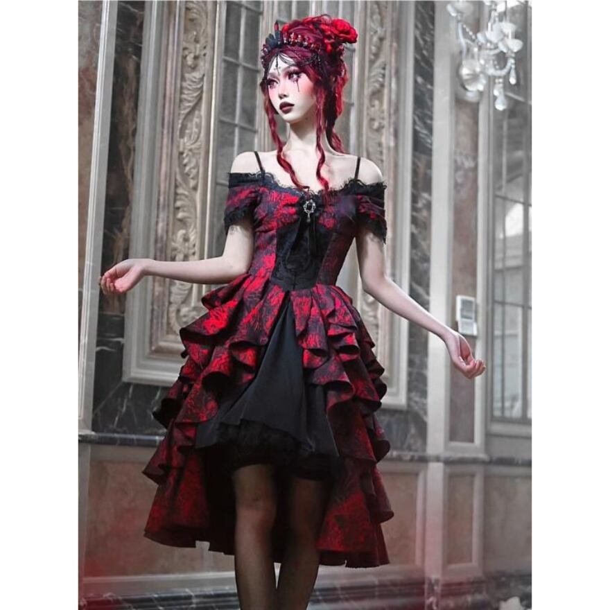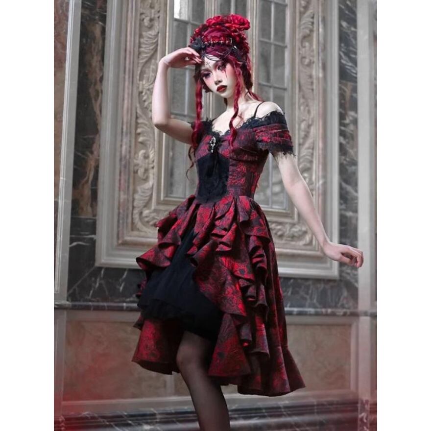 立体感のあるジャガード織り生地にふわっとしたヘム丈デザインのオフショルゴスロリドレスです。
