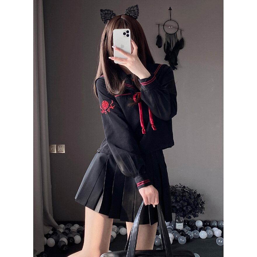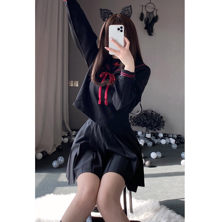 ゴスロリ通販 With U ファッション 長袖セーラー服 ミニスカート プリーツ リボン 制服風 病み可愛い ストリート系 原宿系 地雷服 病みかわいい ゴスロリ服