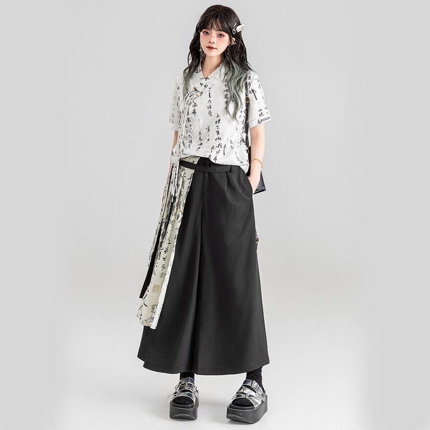 ゴスロリ通販 With U KEIKOシリーズ チャイナ風 ワイドパンツ スカート風 ハイウエスト ルーズ 漢字プリント 病みかわいい 原宿系 大人ゴシック きれいめ ダークファッション