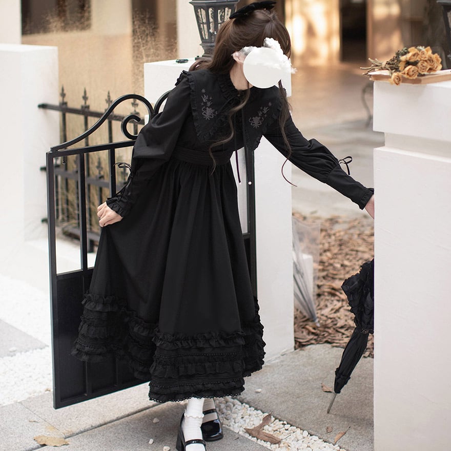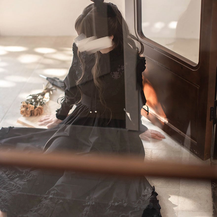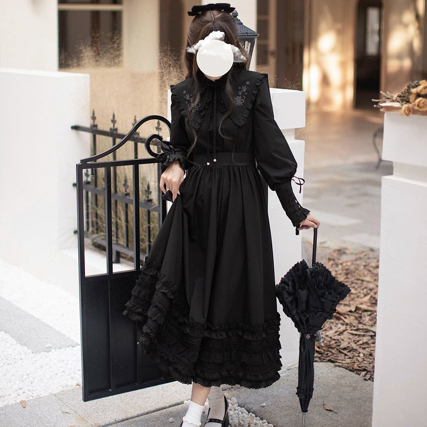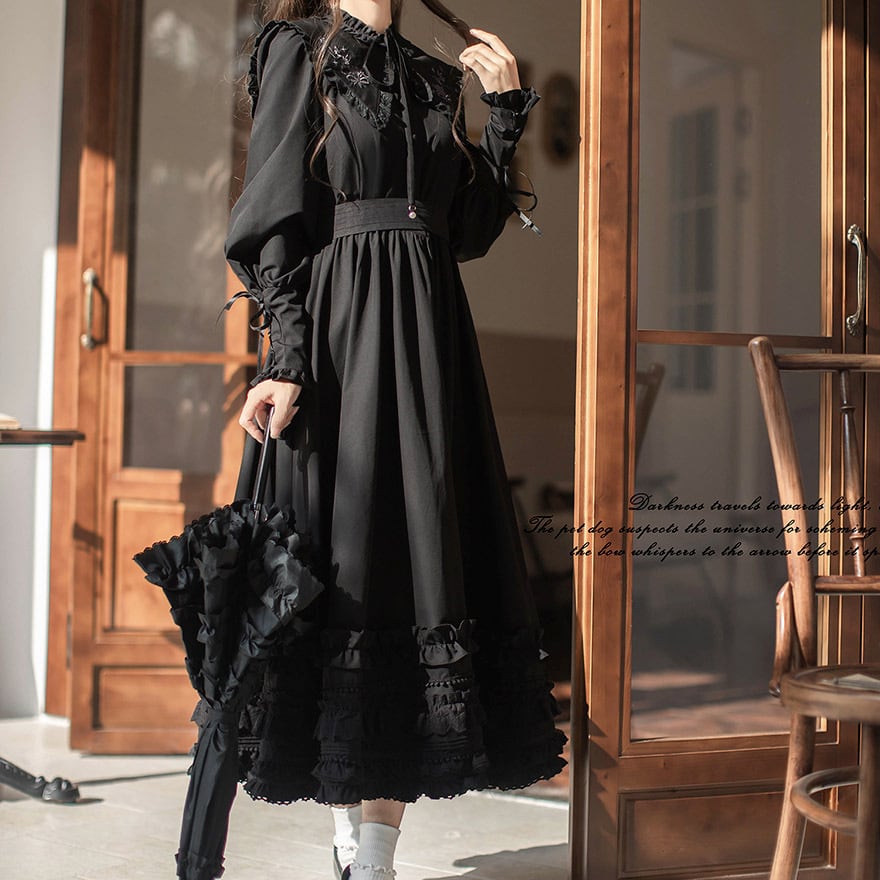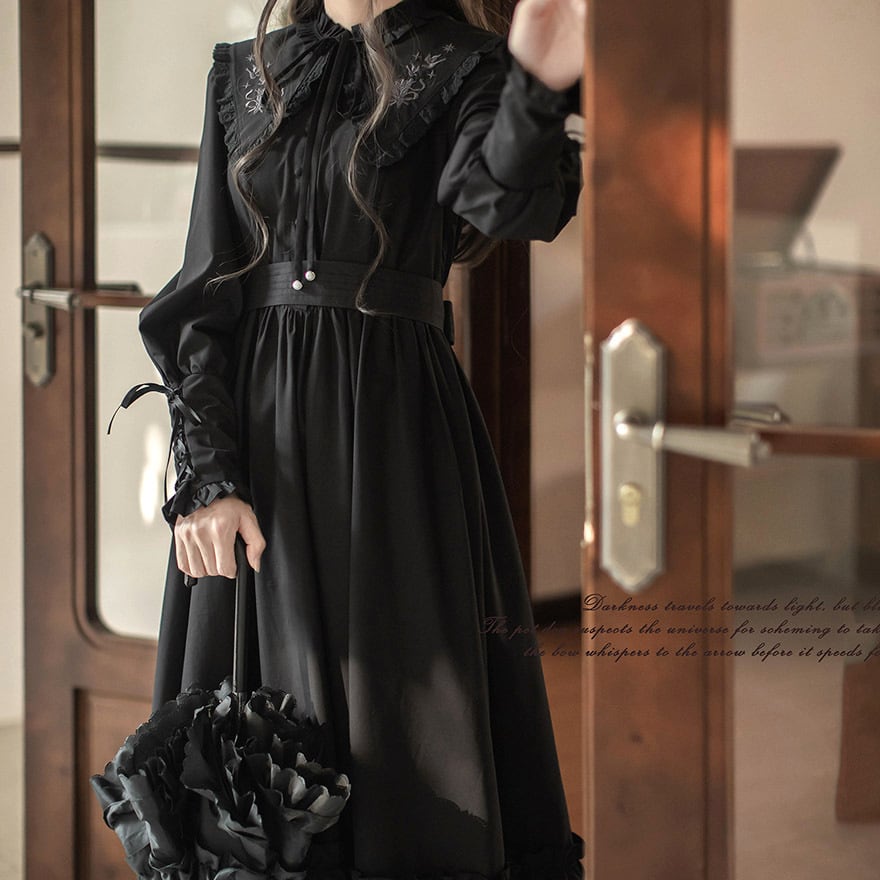 ゴスロリ通販 With U ファッション 秋冬 長袖ワンピース ドレス ヴィンテージ パフスリーブ ウエストリボン付き ゴスロリ 闇かわいい 大人ゴシック エレガント 上品 大人ロリータ 量産型 原宿系 ろりぃたふぁっしょん