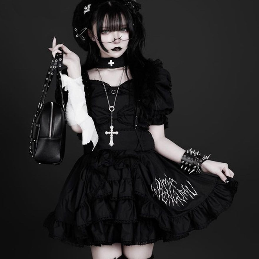 ゴスロリ通販 With U ファッション ゴスロリ ワンピース フリル 半袖 双子コーデ ハイウエスト ダークファッション 病みかわいい 原宿スタイル ロマンティック lolita