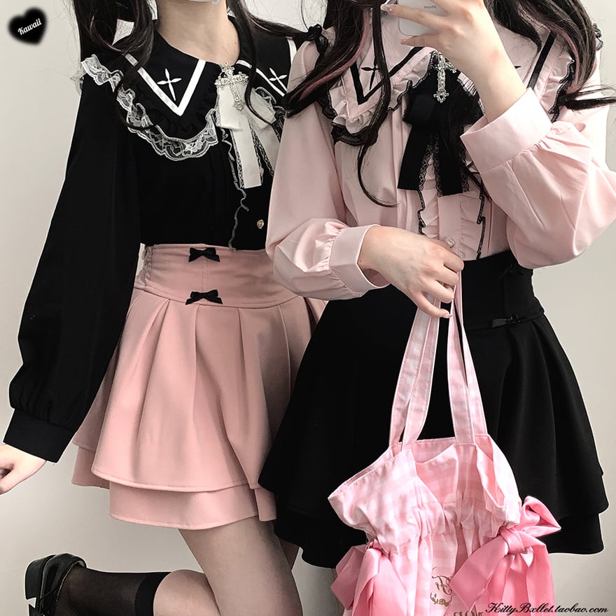 ゴスロリ通販 With U 量産型コーデ 量産型女子 長袖シャツ ビッグカラー レース 十字架 ブラウス 地雷系 レース 病み可愛い ベビードール ゴスロリ服 ろりぃた